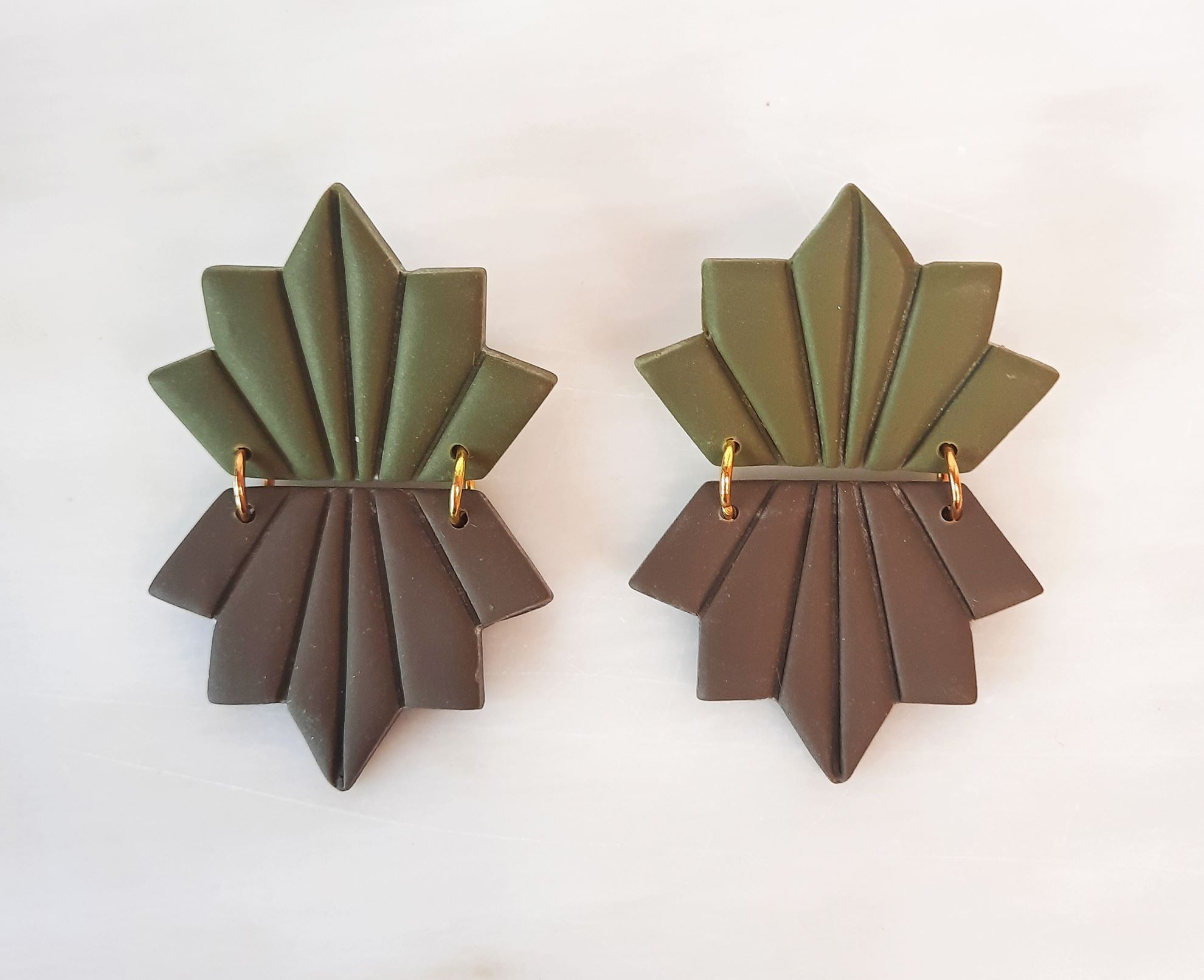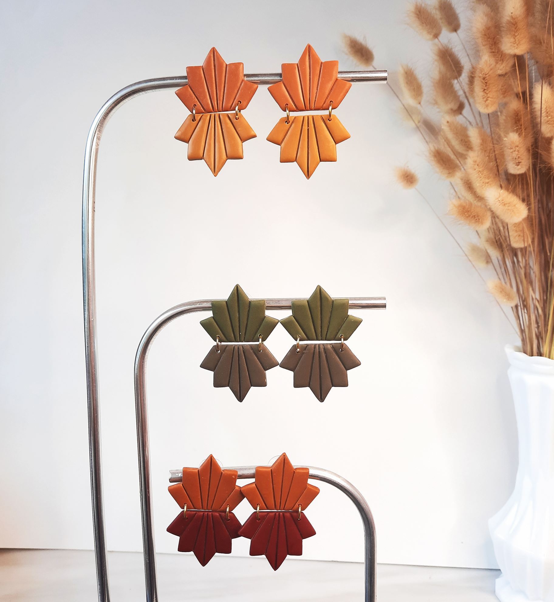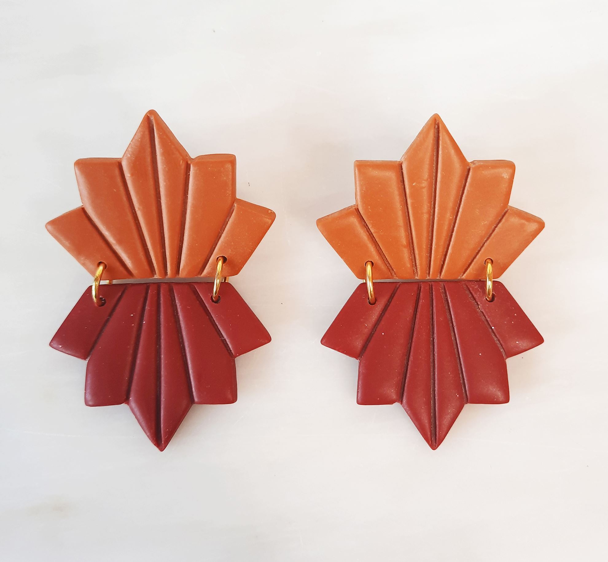 Χειροποίητα σκουλαρίκια από πολυμερικο πηλό σε σχήμα φύλλου ελαφρώς εύκαμπτα σε τρία χρώματα μουσταρδί, λαδί, κεραμιδί,.Κάθε ζεύγος περιέχει από δυο χρωματισμούς, δυνατότητα παραγγελίας και σε αλλά χρώματα κατόπιν συνεννόησης . Στο πίσω μέρος κλείνει με ατσάλινο καρφί και επίχριση η επάργυρη πεταλούδα.