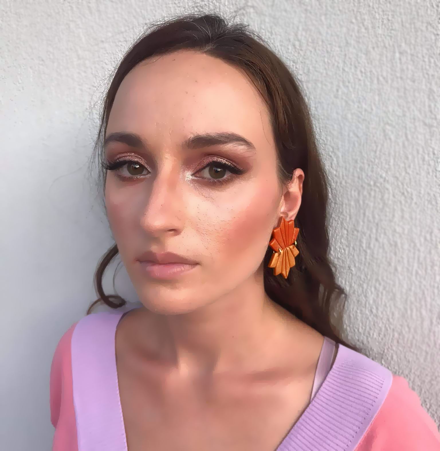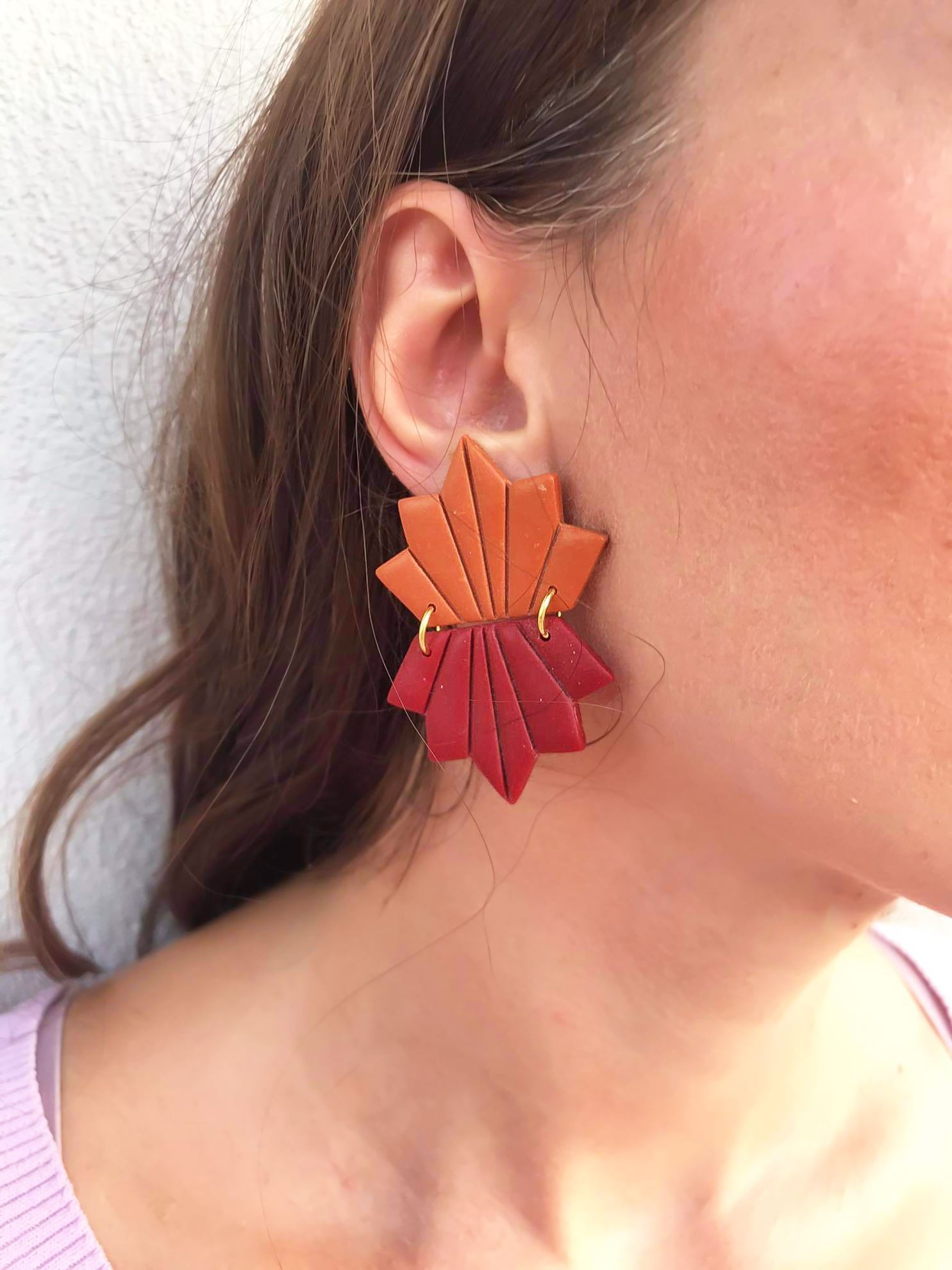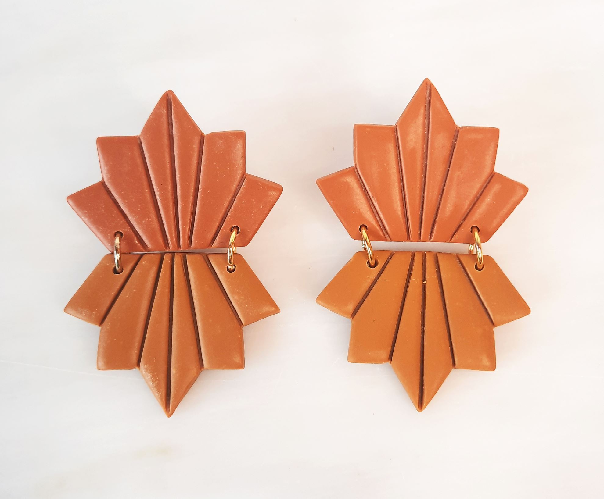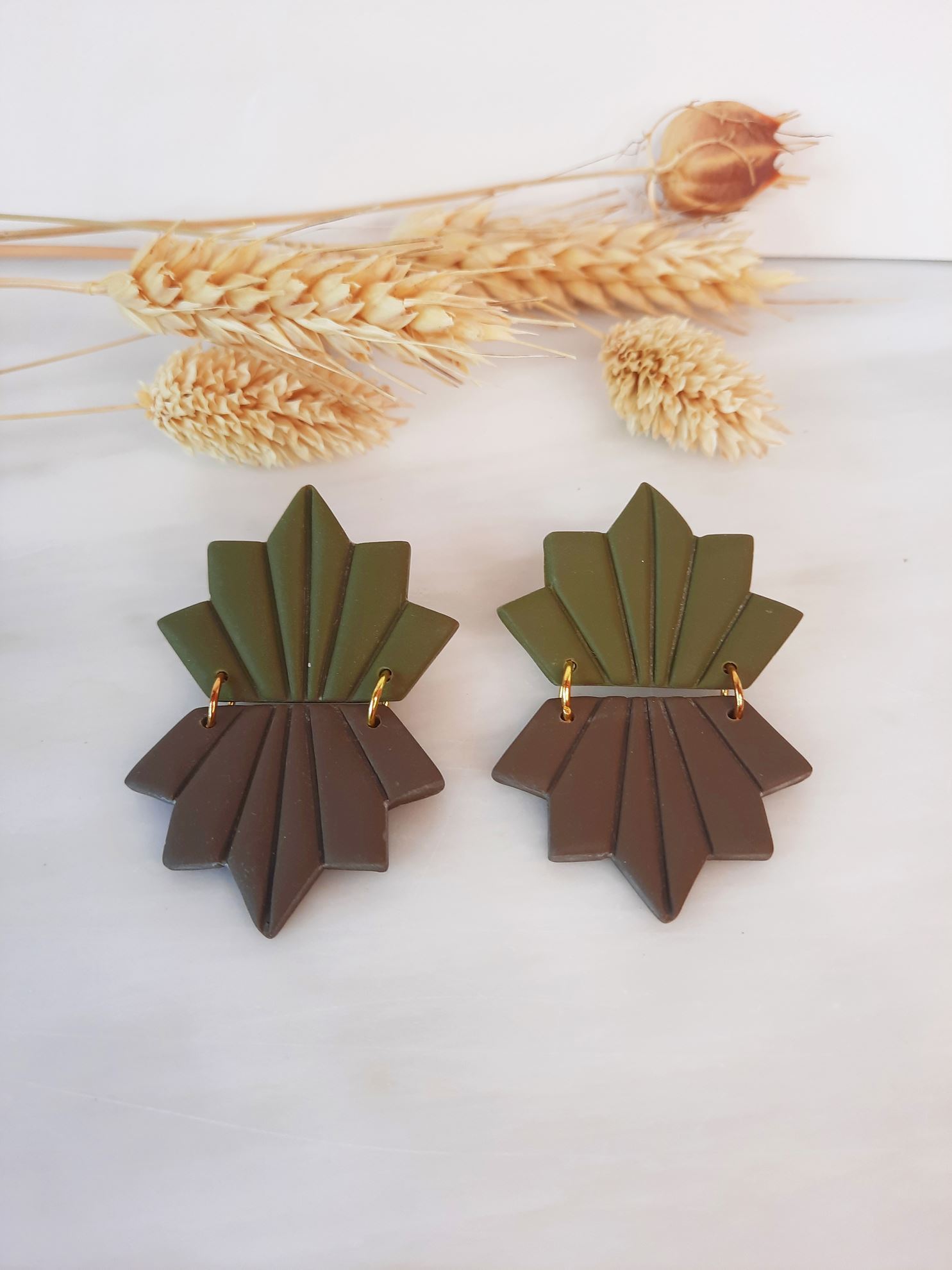 Χειροποίητα σκουλαρίκια από πολυμερικο πηλό σε σχήμα φύλλου ελαφρώς εύκαμπτα σε τρία χρώματα μουσταρδί, λαδί, κεραμιδί,.Κάθε ζεύγος περιέχει από δυο χρωματισμούς, δυνατότητα παραγγελίας και σε αλλά χρώματα κατόπιν συνεννόησης . Στο πίσω μέρος κλείνει με ατσάλινο καρφί και επίχριση η επάργυρη πεταλούδα.