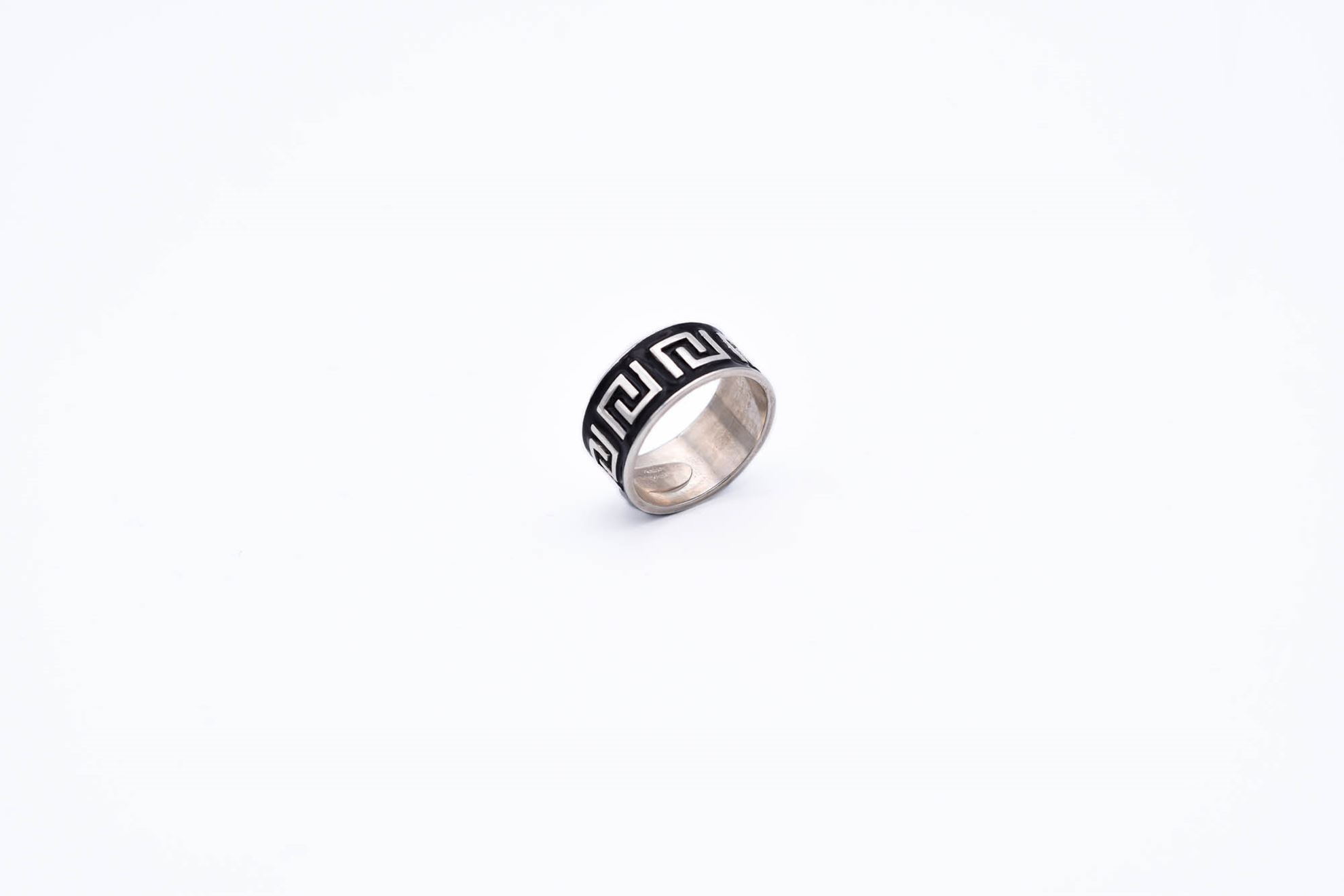 Silver Band Ring with Greek Key Pattern and Enamel