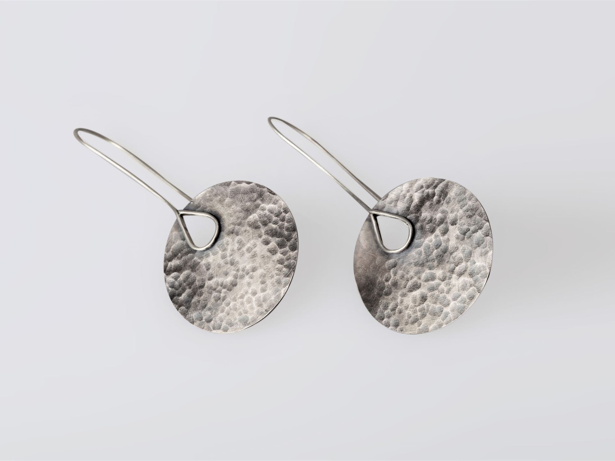 Modern silver earrings. The bottom is hammered and slightly oxidized. An elegant pair of earrings, which you will enjoy from morning to night. Height: about 7 cm NOTE: All threader earrings have a handmade hook. To maintain its shape, silver wire is 0.9 mm thick (19 gauge round wire) instead of the usual 0.8 mm (20 gauge). Τhey suit people who wear earrings regularly.