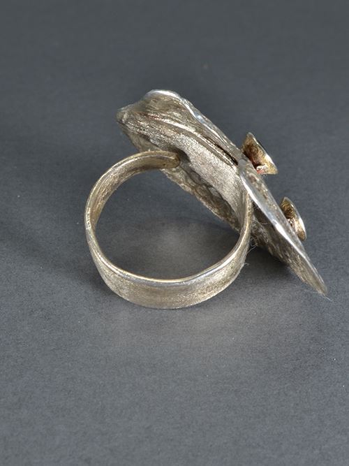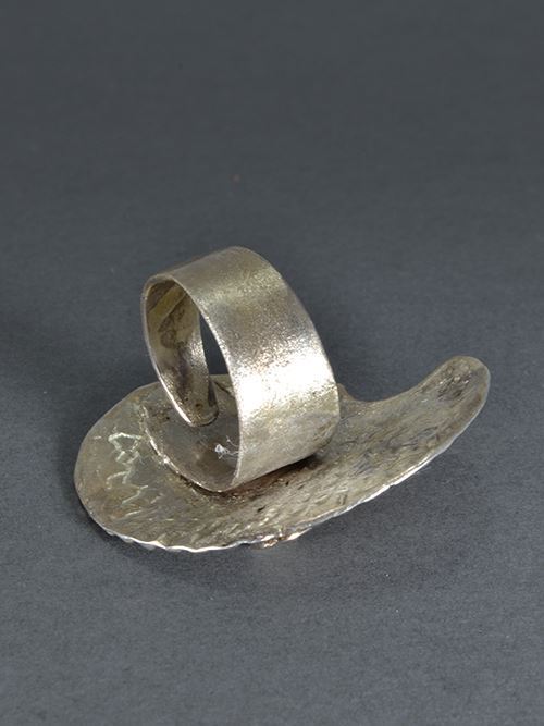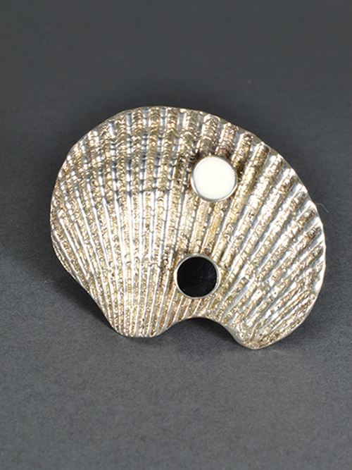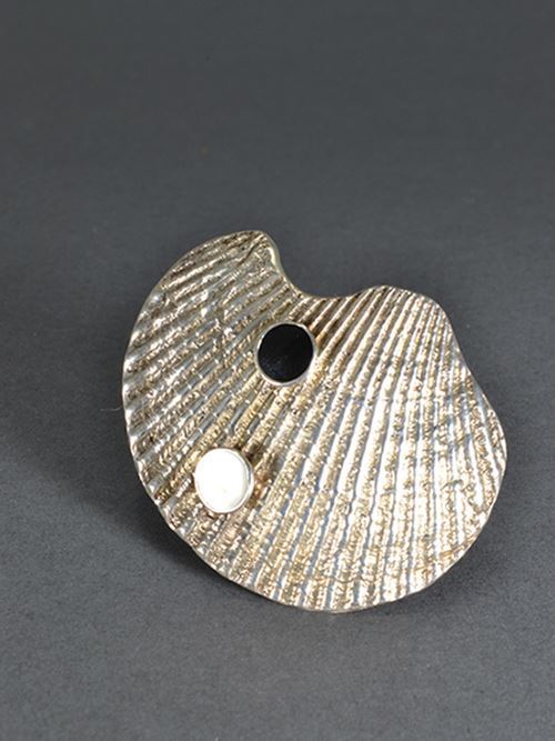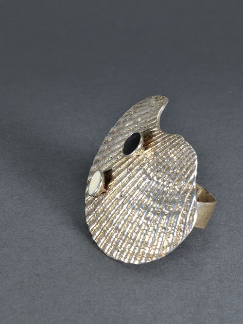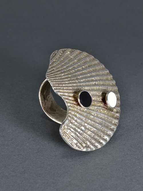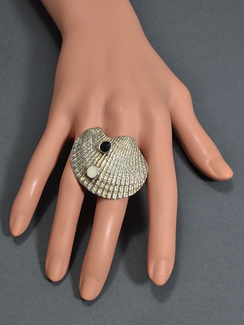 Δαχτυλίδι από ασήμι 925 σχήματος κοχυλιού με δυο μικρά ημισφαίρια με λευκή και μαύρη ρητίνη. Το δαχτυλίδι είναι ανοιχτό, μπορεί δηλαδή να αυξομειωθεί.