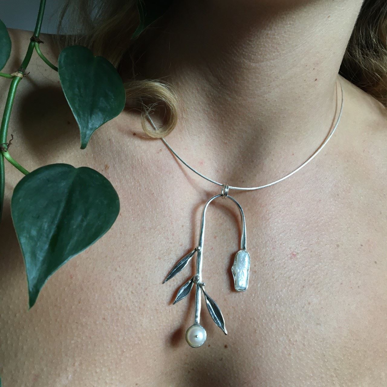 Ασημένιο μοναδικό μενταγιόν με φύλλα ελιάς , διακοσμημένο με λευκά μαργαριτάρια .