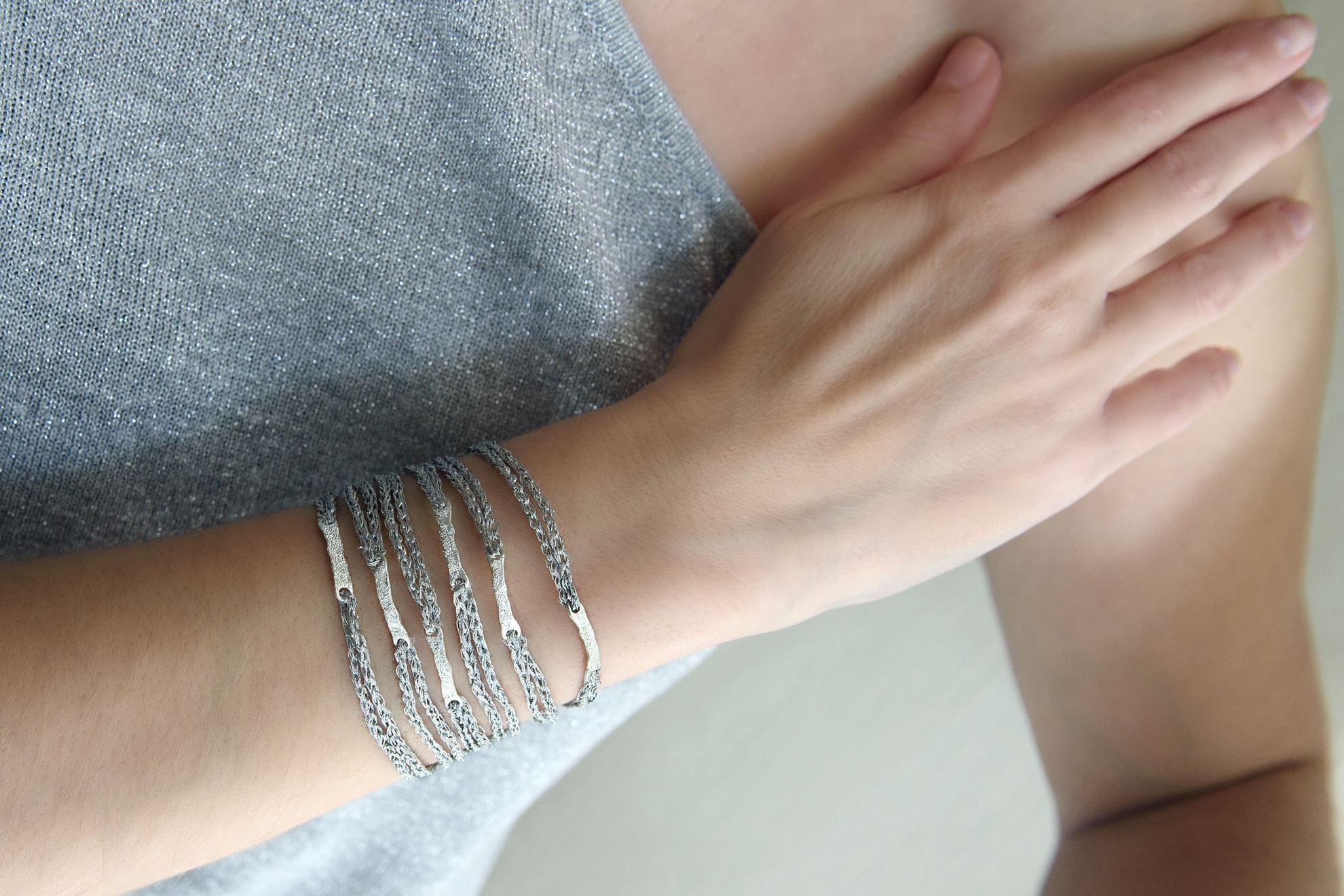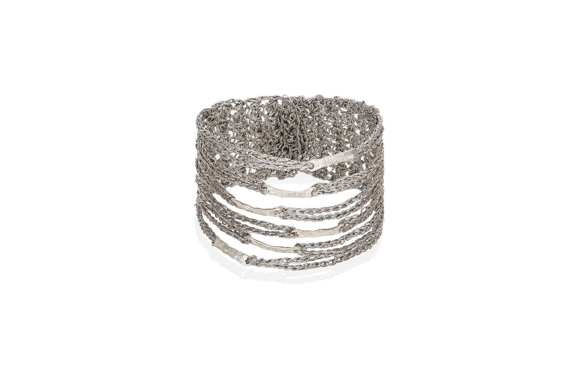 Ασημένιο ή steel βραχιόλι πολύσειρο με ασημένιο κουμπί και 6 ασημένια στοιχεία