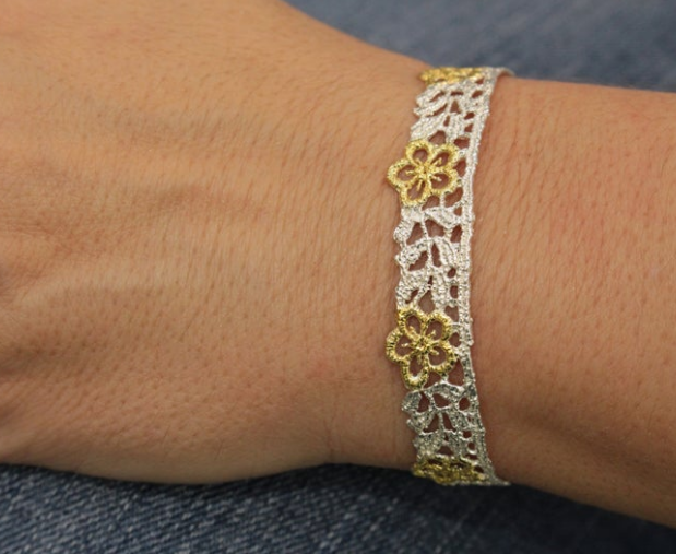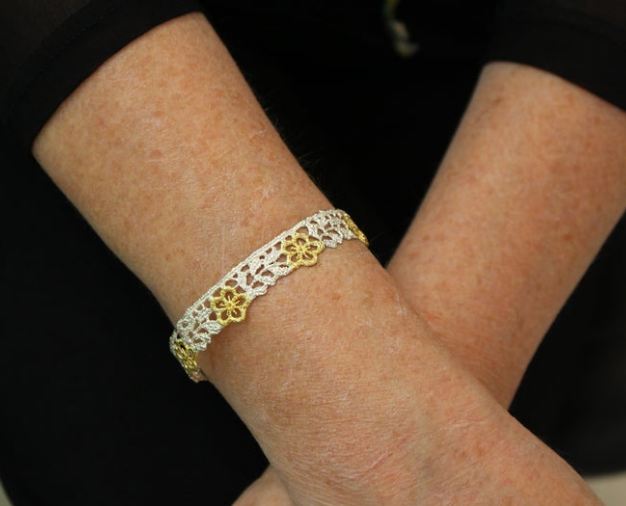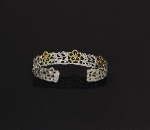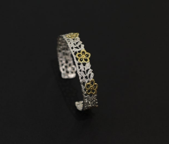 Βραχιόλι χειροπέδα ασήμι 925 με επίχρυσες λεπτομέρειες και σχέδιο μαργαρίτα (στις φωτογραφίες συμπεριλαμβάνονται και τα υπόλοιπα κομμάτια του σετ)