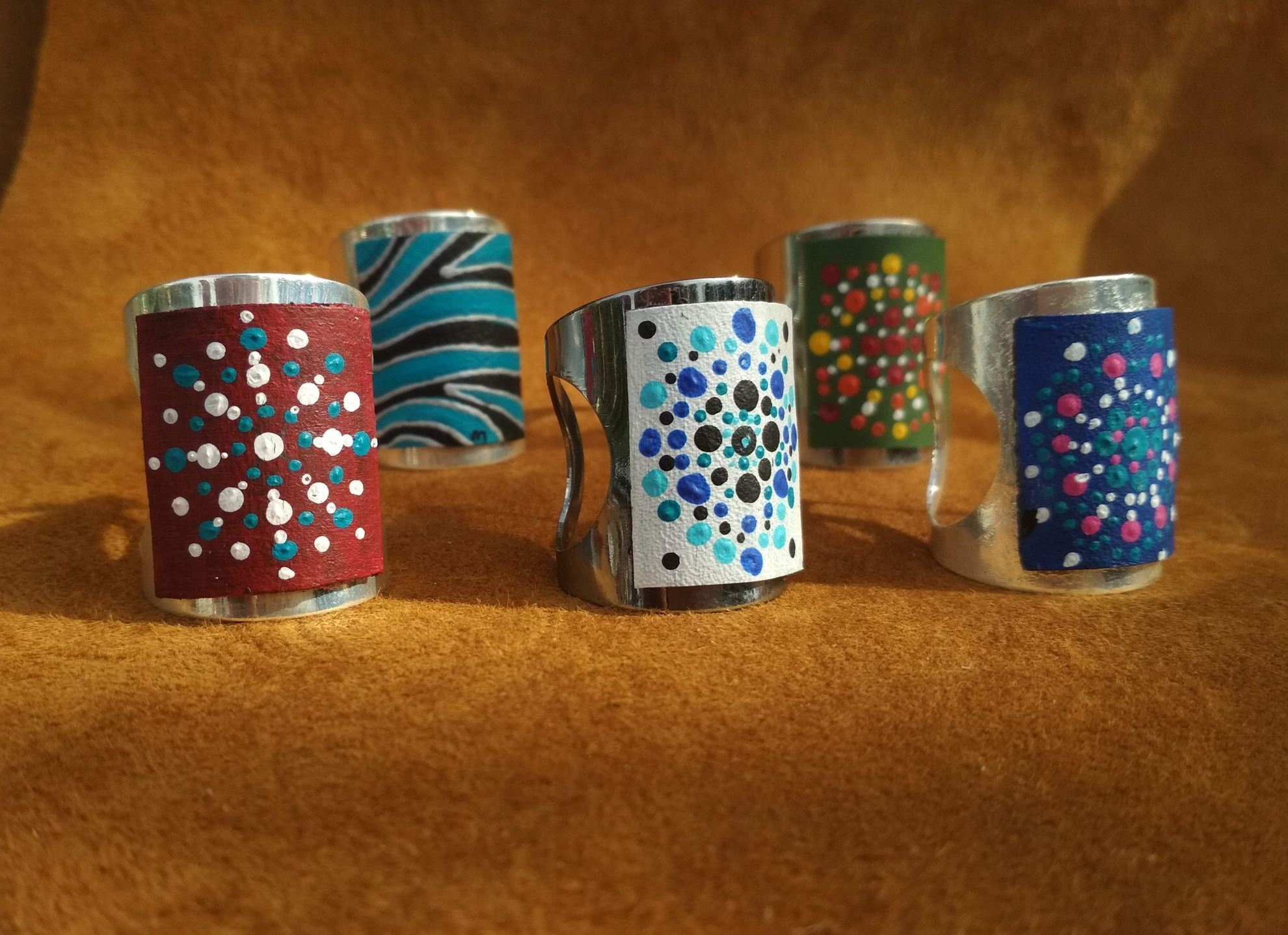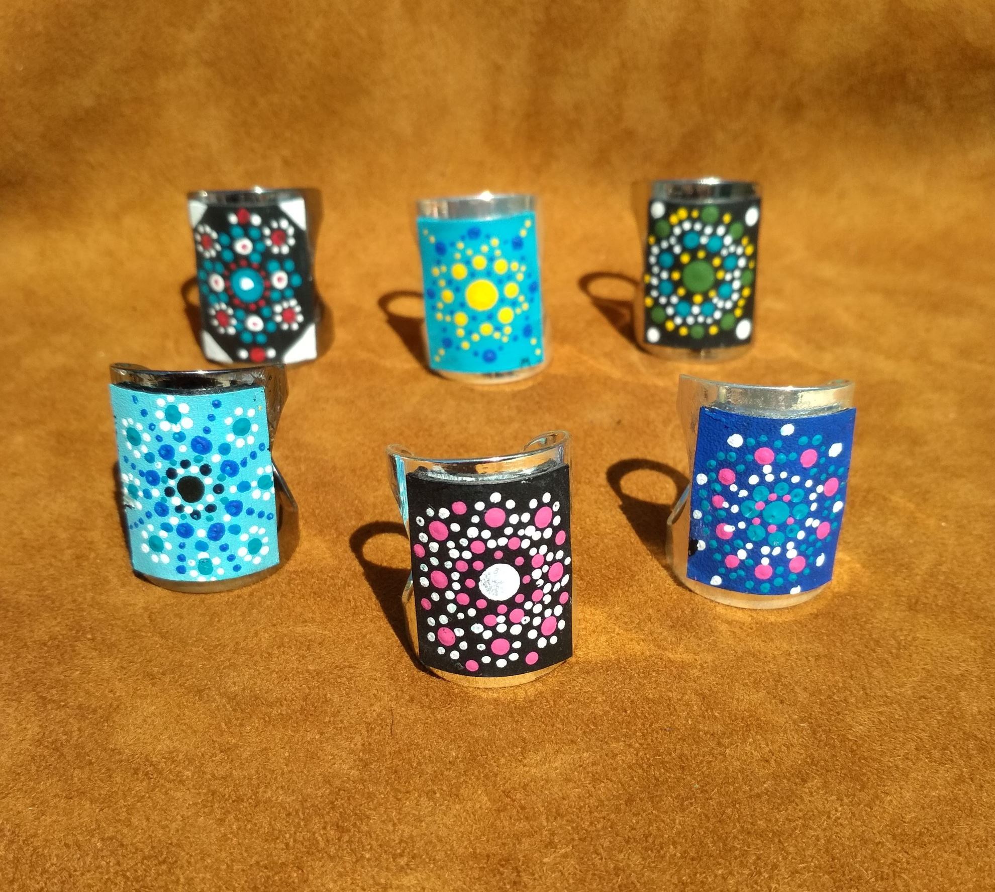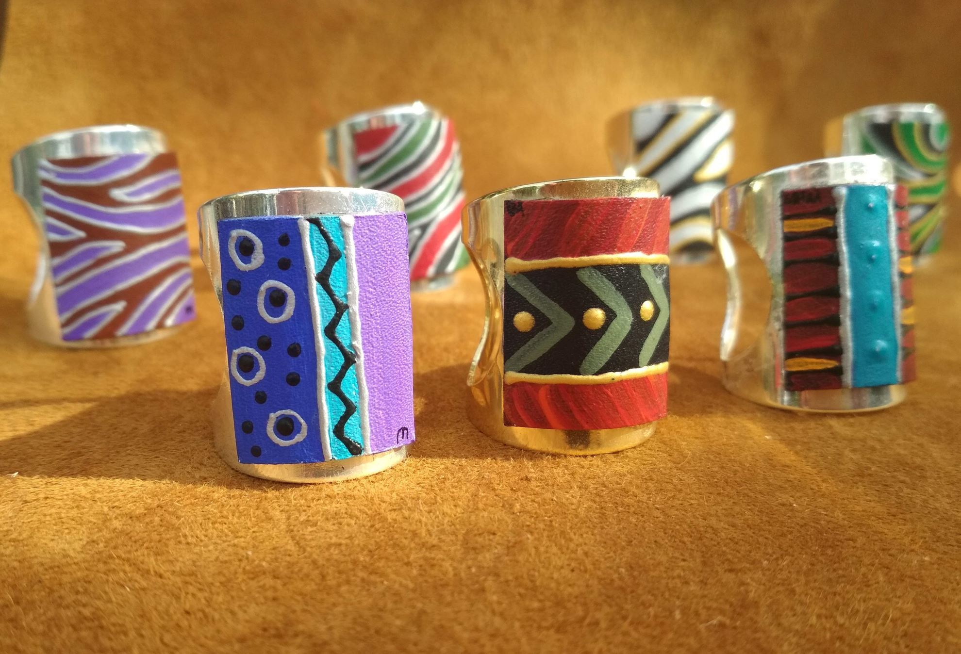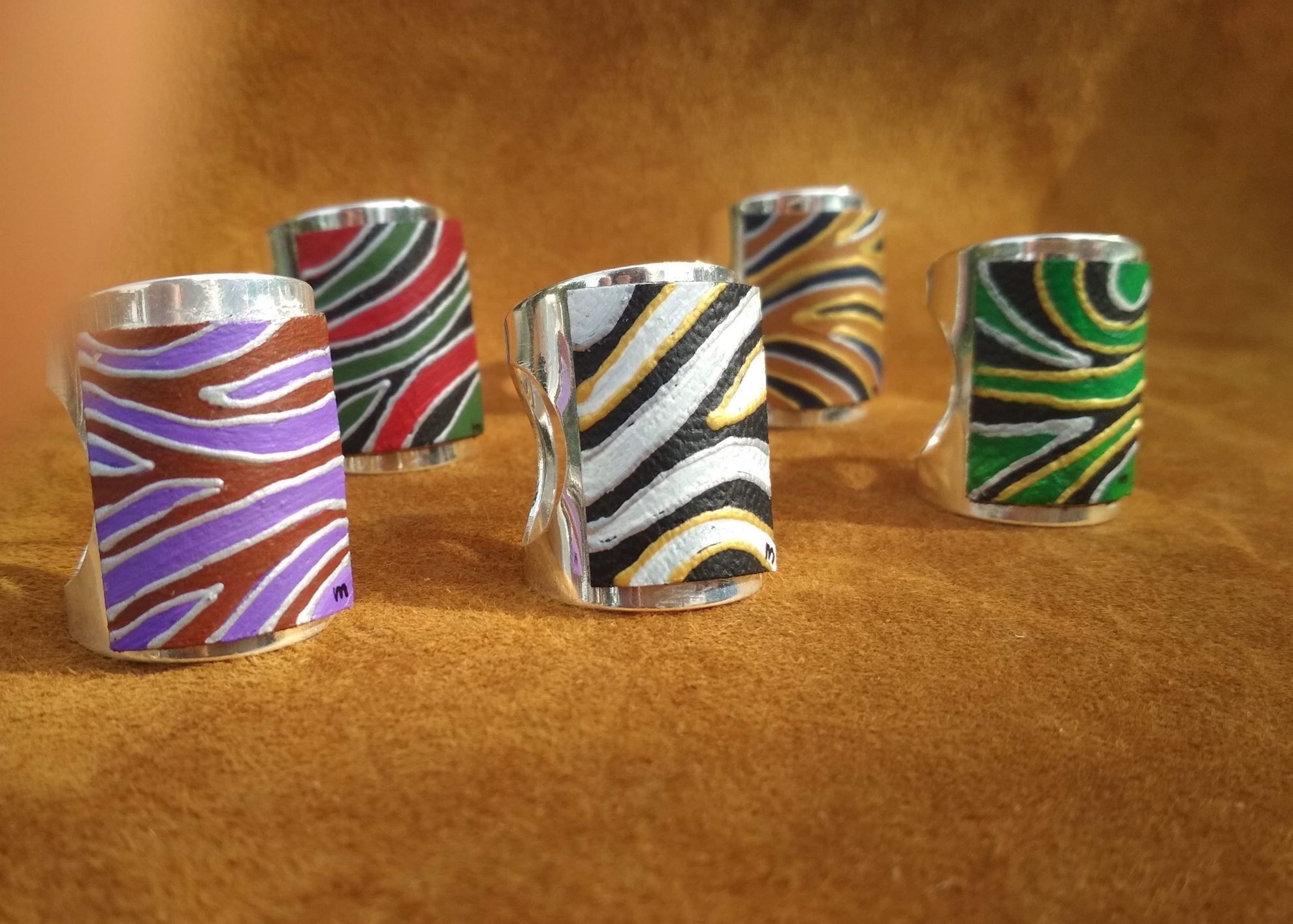Δακτυλίδι μεταλλικό, με δέρμα ζωγραφισμένο στο χέρι. Υποαλλεργικό μέταλλο. Διαστάσεις όψης: 3 Χ 2 cm. Mέγεθος: αυξομειούμενο, ώστε να ταιριάζει σε όλα τα μεγέθη. Φοριέται στον δείκτη, τον μέσο και τον παράμεσο δάκτυλο.Διατίθεται σε πολλούς χρωματικούς συνδυασμούς. Το κάθε κόσμημα είναι μοναδικό και μπορούμε να σας στείλουμε φωτογραφίες από όλα τα υπάρχοντα σχέδια και χρώματα ώστε να διαλέξετε αυτά που επιθυμείτε.