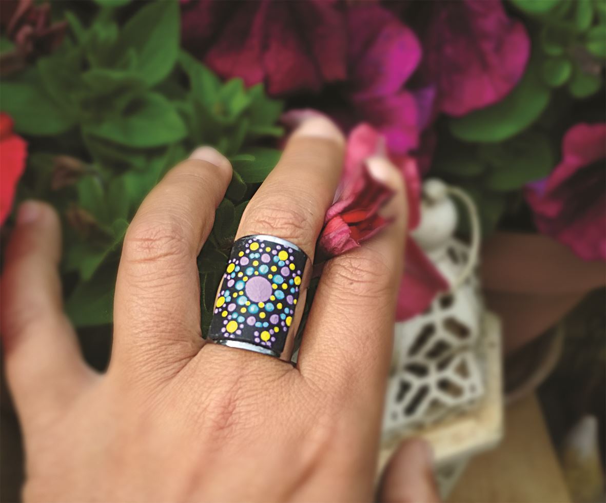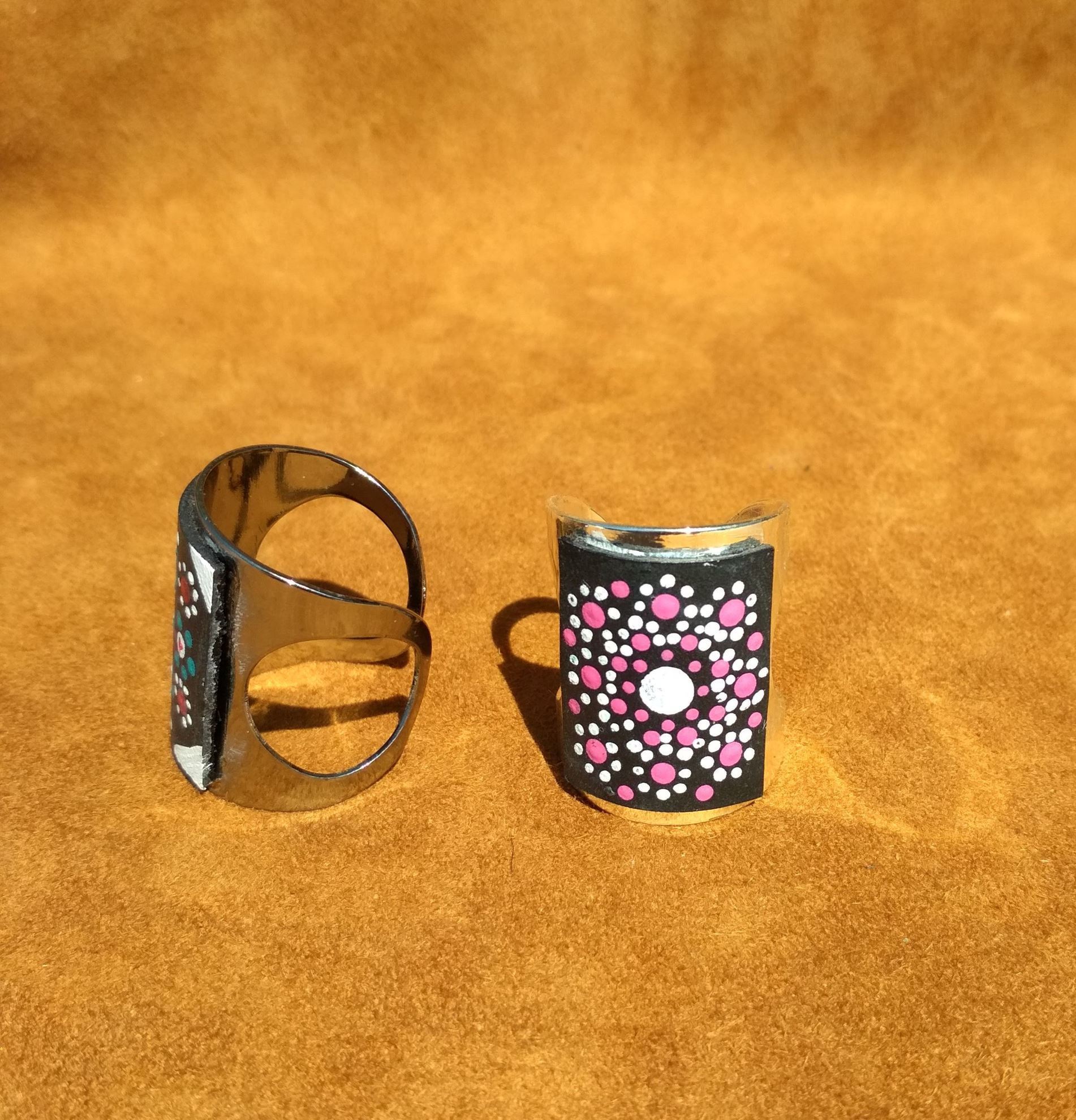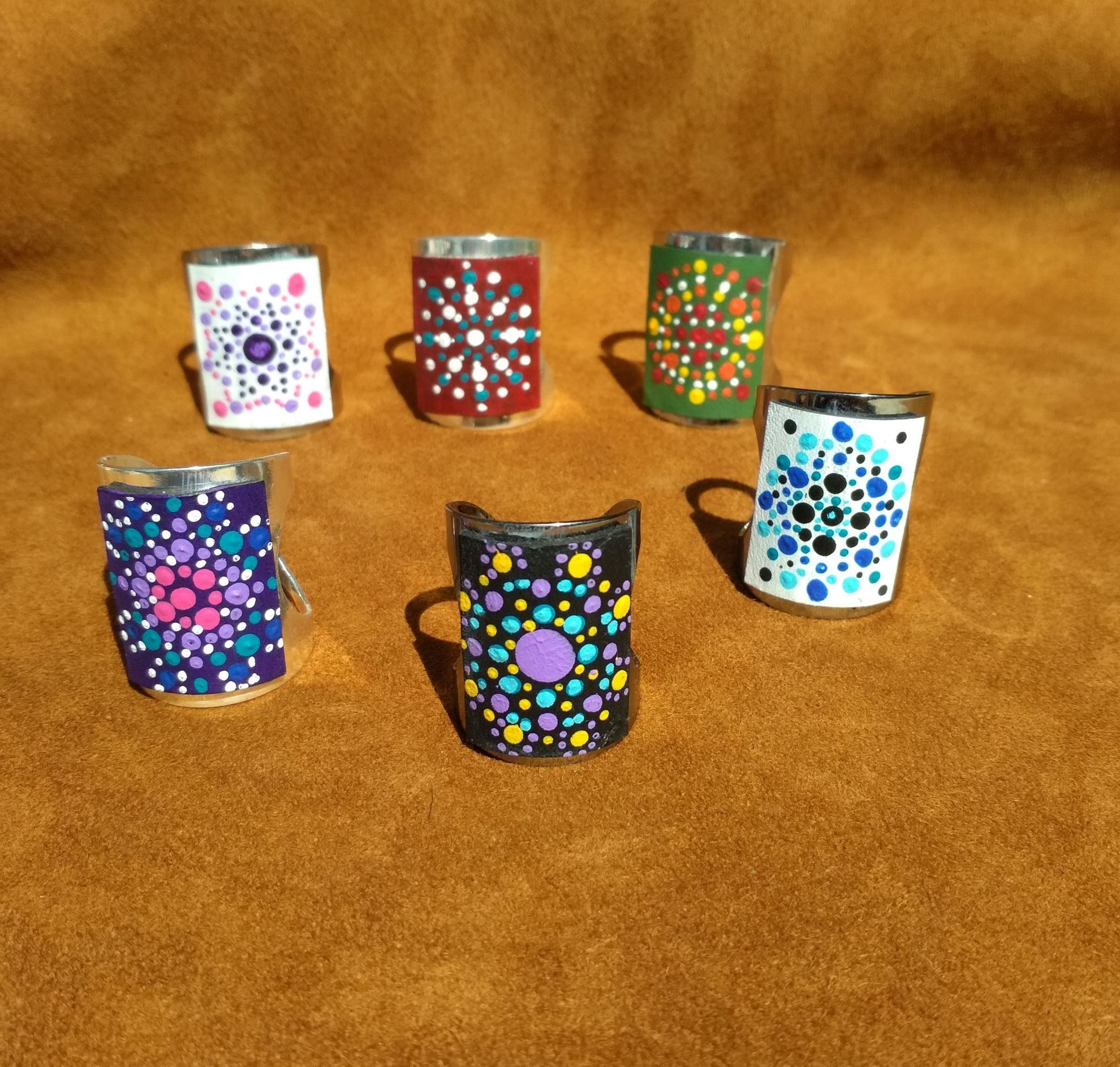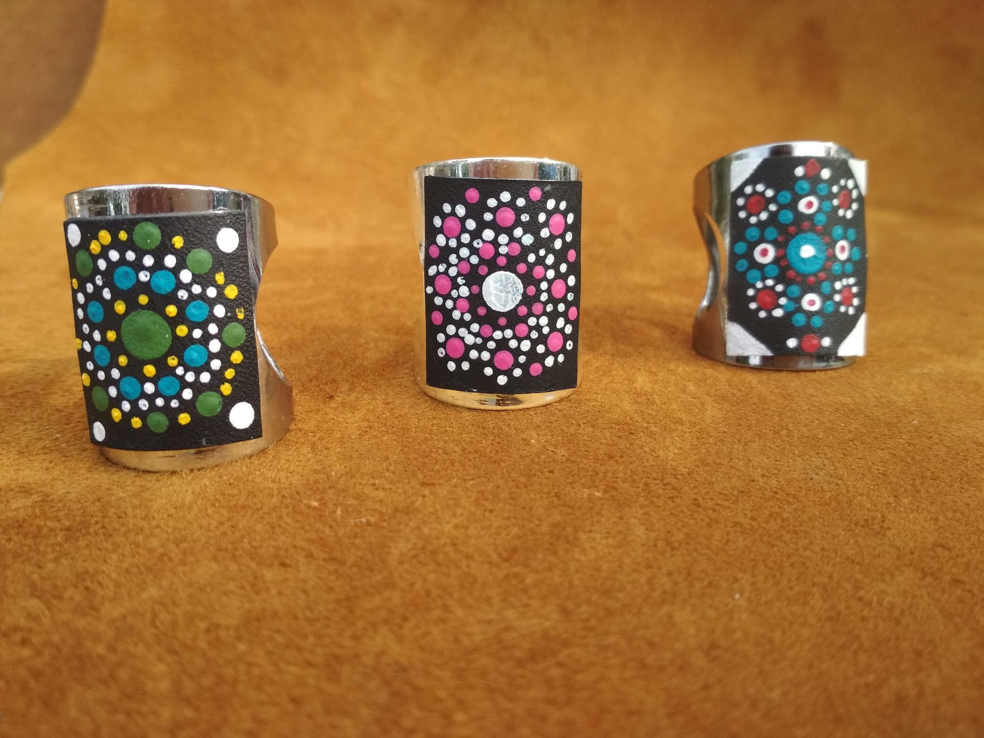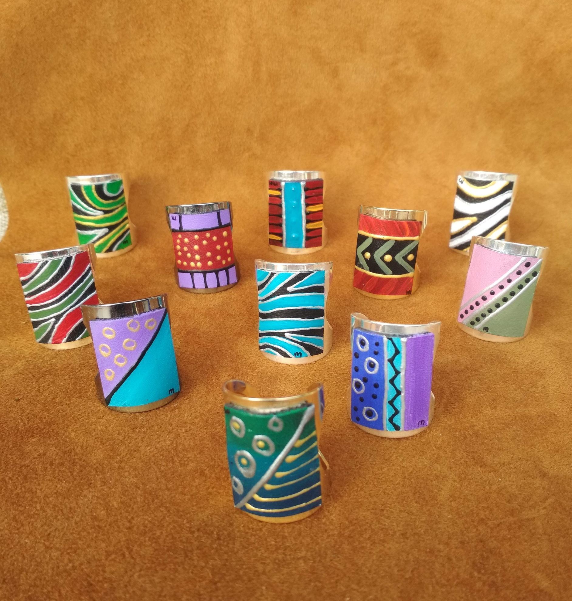 Δακτυλίδι μεταλλικό, με δέρμα ζωγραφισμένο στο χέρι. Υποαλλεργικό μέταλλο. Διαστάσεις όψης: 3 Χ 2 cm. Mέγεθος: αυξομειούμενο, ώστε να ταιριάζει σε όλα τα μεγέθη. Φοριέται στον δείκτη, τον μέσο και τον παράμεσο δάκτυλο.Διατίθεται σε πολλούς χρωματικούς συνδυασμούς. Το κάθε κόσμημα είναι μοναδικό και μπορούμε να σας στείλουμε φωτογραφίες από όλα τα υπάρχοντα σχέδια και χρώματα ώστε να διαλέξετε αυτά που επιθυμείτε.