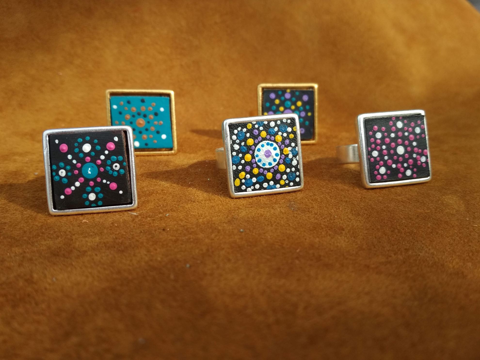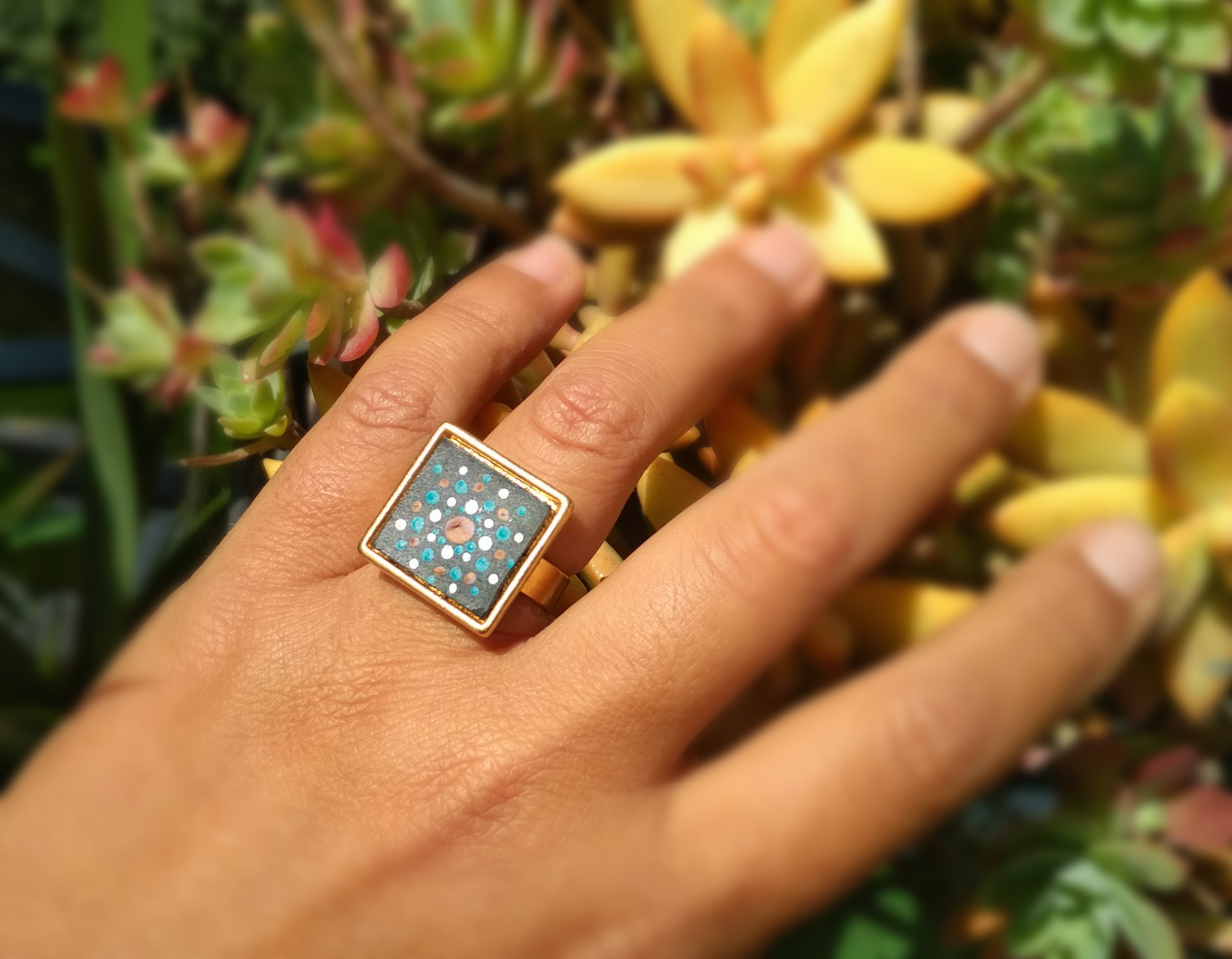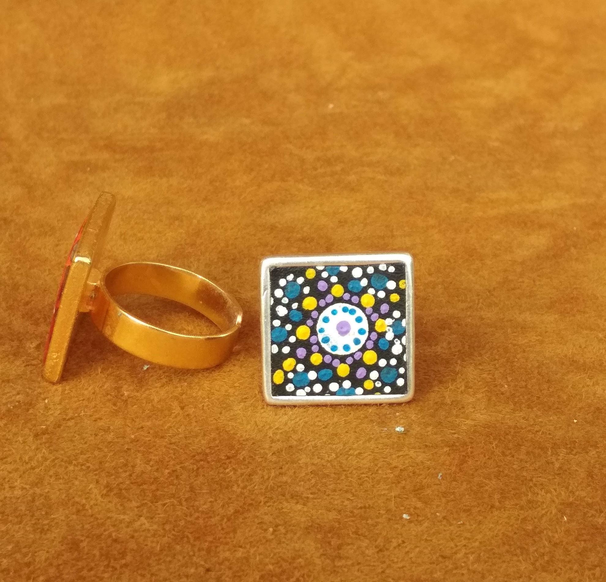 Δακτυλίδι τετράγωνο μεταλλικό, με δέρμα ζωγραφισμένο στο χέρι. Διαστάσεις όψης: 2 Χ 2εκ. Μέγεθος: αυξομειούμενο, ώστε να ταιριάζει σε όλα τα μεγέθη. Φοριέται στον δείκτη, τον μέσο και τον παράμεσο δάκτυλο.Διατίθεται σε πολλούς χρωματικούς συνδυασμούς. Το κάθε κόσμημα είναι μοναδικό και μπορούμε να σας στείλουμε φωτογραφίες από όλα τα υπάρχοντα σχέδια και χρώματα ώστε να διαλέξετε αυτά που επιθυμείτε.