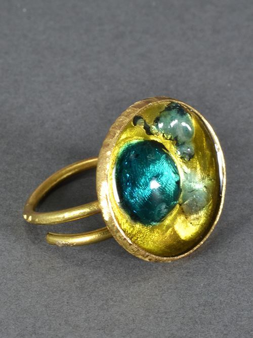 Δαχτυλίδι χειροποίητο από μπρούντζο με ρητίνη και ψημένο γυαλί. Διάμετρος δίσκου 2 cm, η γάμπα είναι ανοιχτή. έτσι ώστε να μπορεί να αυξομειωθεί.