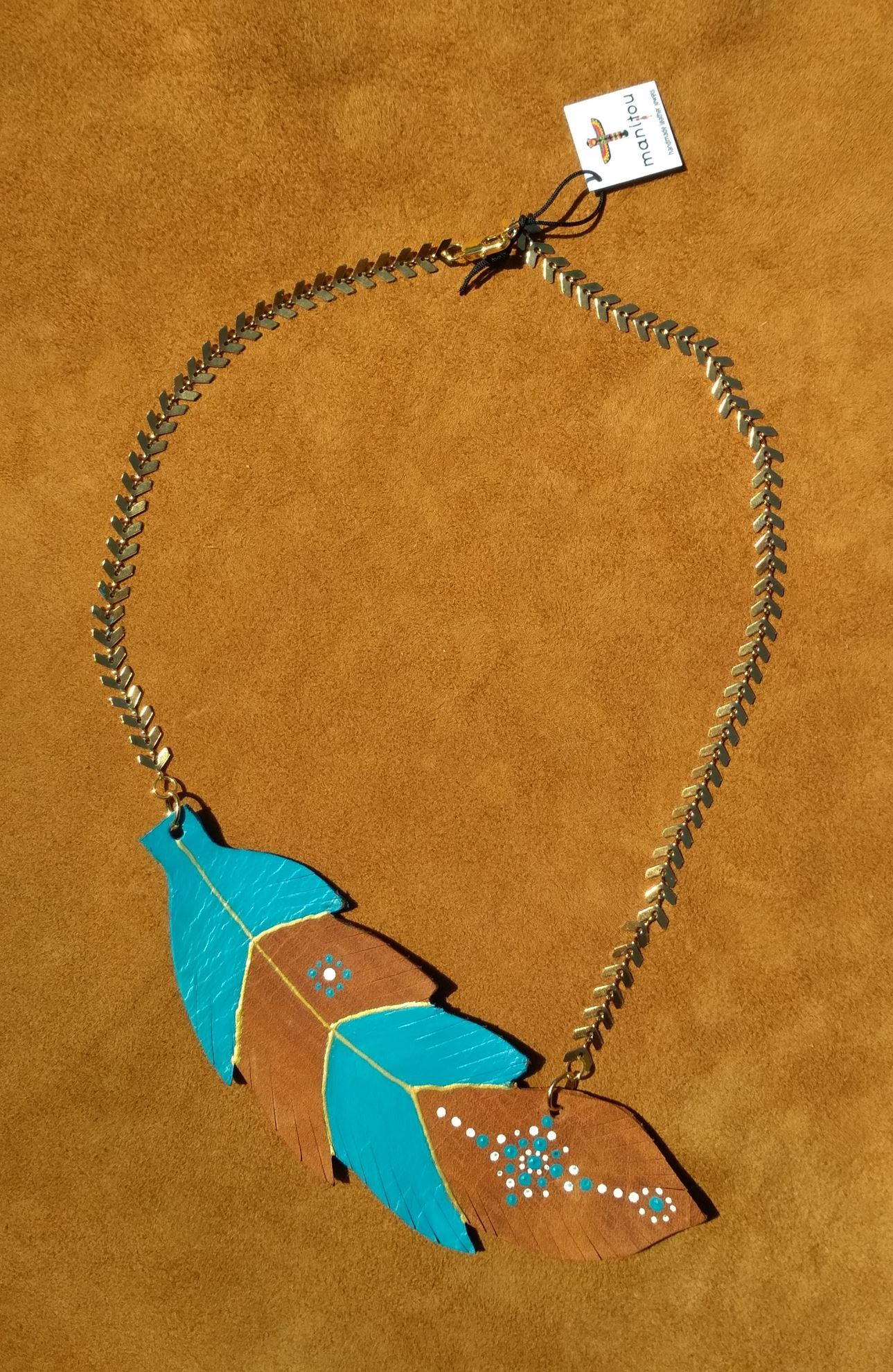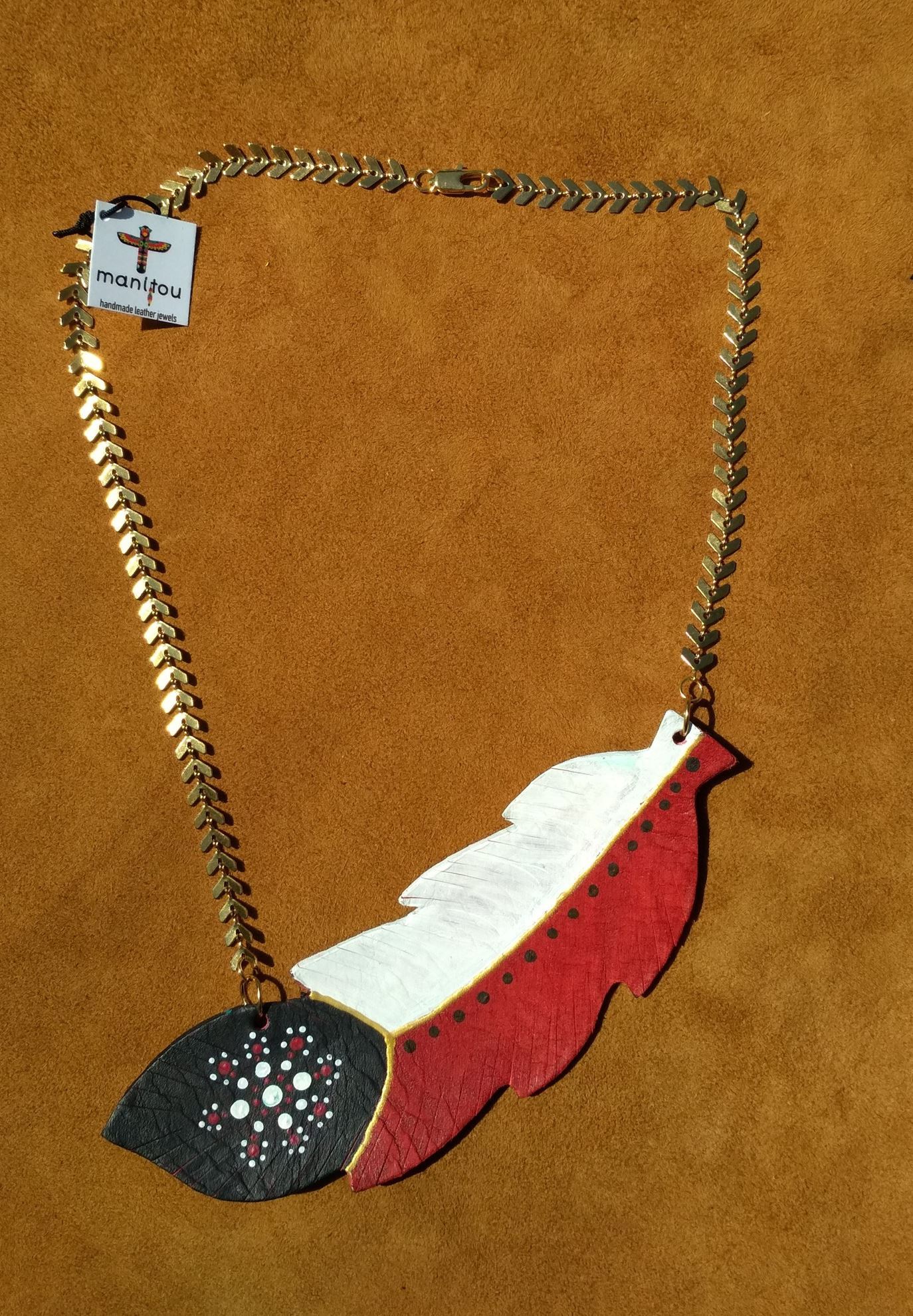 Κολιέ κοντό στο λαιμό, δερμάτινο φτερό medium, κομμένο και ζωγραφισμένο στο χέρι, συνδυασμένο με αλυσίδα βέλος, από επιχρυσωμένο ατσάλι. Διατίθεται σε πολλούς χρωματικούς συνδυασμούς. Το κάθε κόσμημα είναι μοναδικό και μπορούμε να σας στείλουμε φωτογραφίες από όλα τα υπάρχοντα σχέδια και χρώματα ώστε να διαλέξετε αυτά που επιθυμείτε.