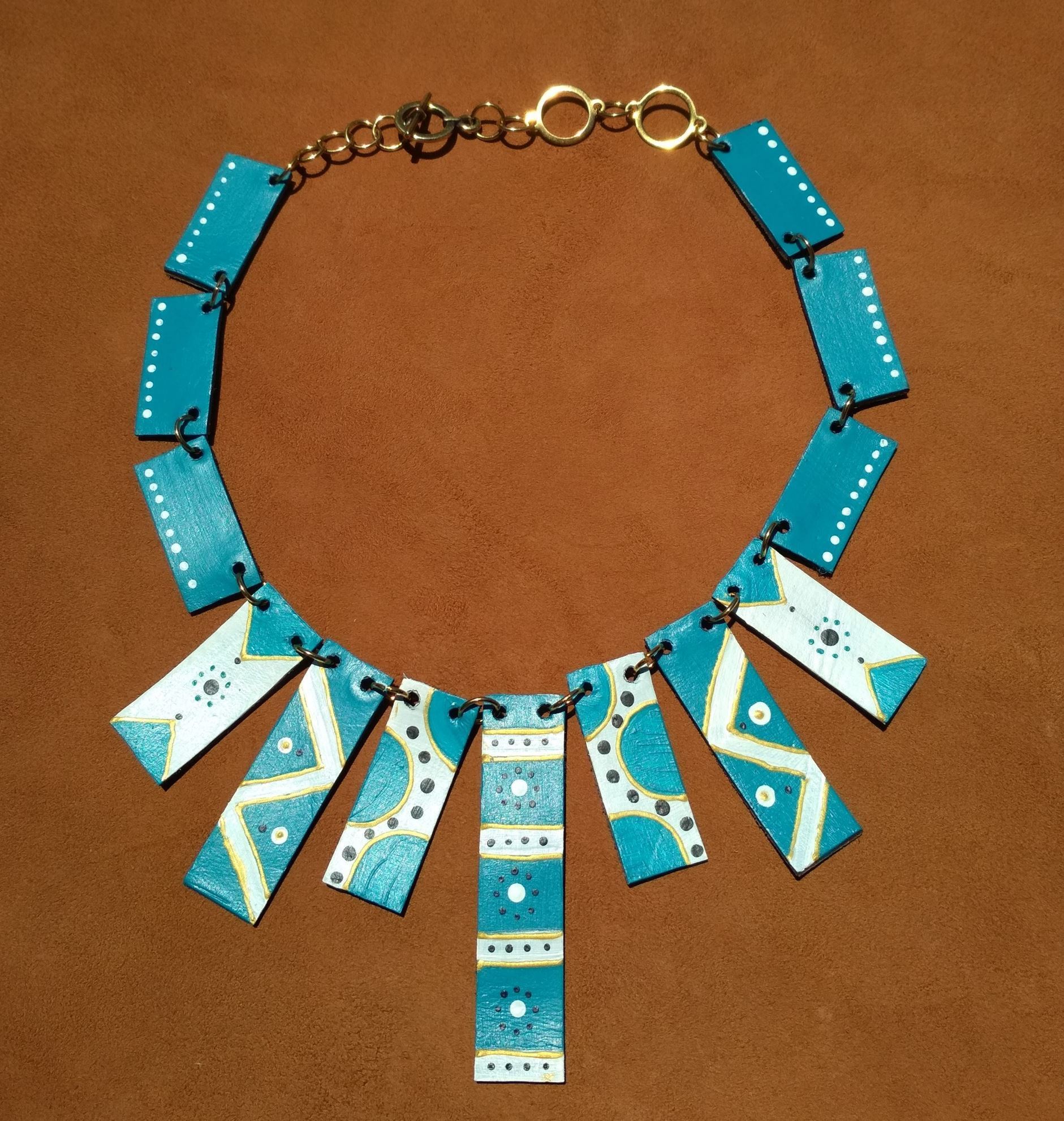 Κολιέ κοντό στο λαιμό, με 3,4 ή 5 δερμάτινα κρεμαστά φτερά, ζωγραφισμένα και κομμένα στο χέρι, συνδυασμένο με ημιπολύτιμες πέτρες. Τιμή: 3 φτερά: 16 ευρώ, 4 φτερά: 17 ευρώ, 5 φτερά: 18 ευρώ Διατίθεται σε πολλούς χρωματικούς συνδυασμούς. Το κάθε κόσμημα είναι μοναδικό και μπορούμε να σας στείλουμε φωτογραφίες από όλα τα υπάρχοντα σχέδια και χρώματα ώστε να διαλέξετε αυτά που επιθυμείτε.