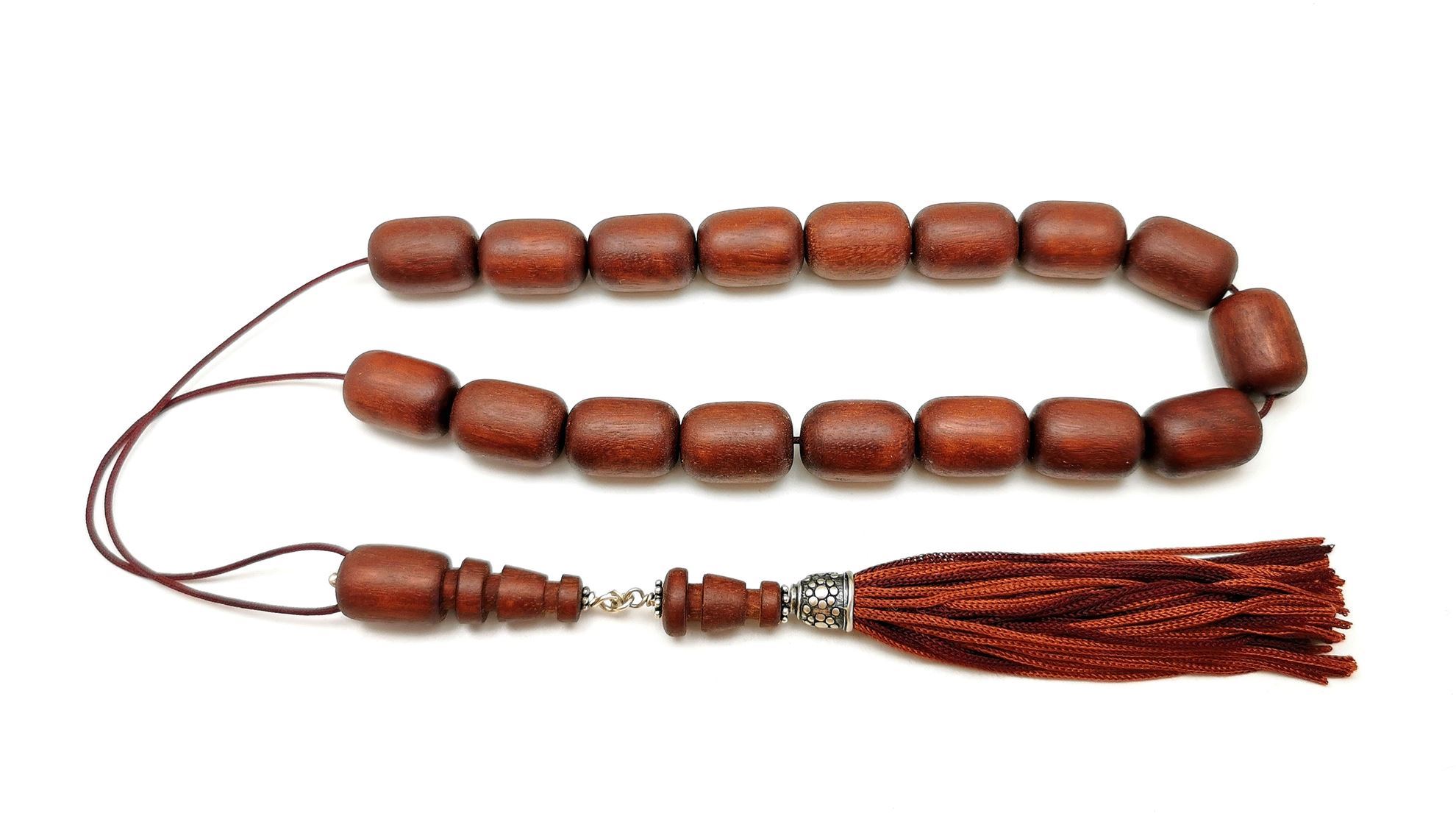Χειροποίητο αρωματικό κομπολόι από Ελληνικό Ευκάλυπτο, μέγεθος χάντρας 14x19mm, δέσιμο με ασήμι 925 και φούντα από φυτικό μετάξι που δεν τσαλακώνεται και δεν ξεφτίζει. Παραδίδεται σε κασετίνα και συνοδεύεται με πιστοποιητικό έντυπο που περιγράφει τη διαδικασία κατασκευής του. Τα προϊόντα μας στη σειρά ‘χειροποίητο ξύλο’ είναι όλα από Ελληνικά ξύλα που μαζεύονται από την Ελληνική ύπαιθρο, μετά τοποθετούνται σε σκιερό μέρος και σκεπάζονται με πριονίδι για περίπου 12 έως 16 μήνες αναλόγως το ξύλο, ώστε να αποβάλουν κάθε ίχνος υγρασίας!!! Μετά αρχίζει το τεμάχισμα και η χειροποίητη επεξεργασία μίας – μίας χάντρας σε τόρνο σμιλεύοντάς την με το χέρι!!! Αφού της δώσουμε το σχήμα, προχωράμε στο φινίρισμα, αυτό σημαίνει 5 ‘χέρια’ με διαφορετικό νούμερο γυαλόχαρτου και όταν η χάντρα μας είναι έτοιμη γίνεται επάλειψη με φυσικό κερί μέλισσας και αιθέρια έλαια!!! Το δέσιμο μπορεί να είναι με ασήμι 925 ή απλό μέταλλο, αναλόγως την επιθυμία σας και η φούντα από φυτικό μετάξι!!! Το κάθε κομπολόι είναι μοναδικό, δεν μοιάζει με κανένα άλλο ακόμα και από το ίδιο κομμάτι ξύλου!!! Όλα αυτά για να γνωρίζει ο κάτοχος ενός τέτοιου κομπολογιού, τι κρατάει στα χέρια του!!! Λόγω της ιδιαιτερότητάς τους, όπως αντιλαμβάνεστε, είναι περιορισμένης παραγωγής!!! Τα διαθέσιμα αυτή τη στιγμή ξύλα είναι: Ελιά – Αμυγδαλιά – Βερικοκιά – Ακακία – Δρυς – Πουρνάρι – Βελανιδιά – Κουμαριά – Σκίνος – Αγριελιά – Κουτσουπιά – Μουριά – Πορτοκαλιά – Βίδι – Ευκάλυπτος – Καρυδιά – Ιτιά – Κερασιά – Κυπαρίσσι.