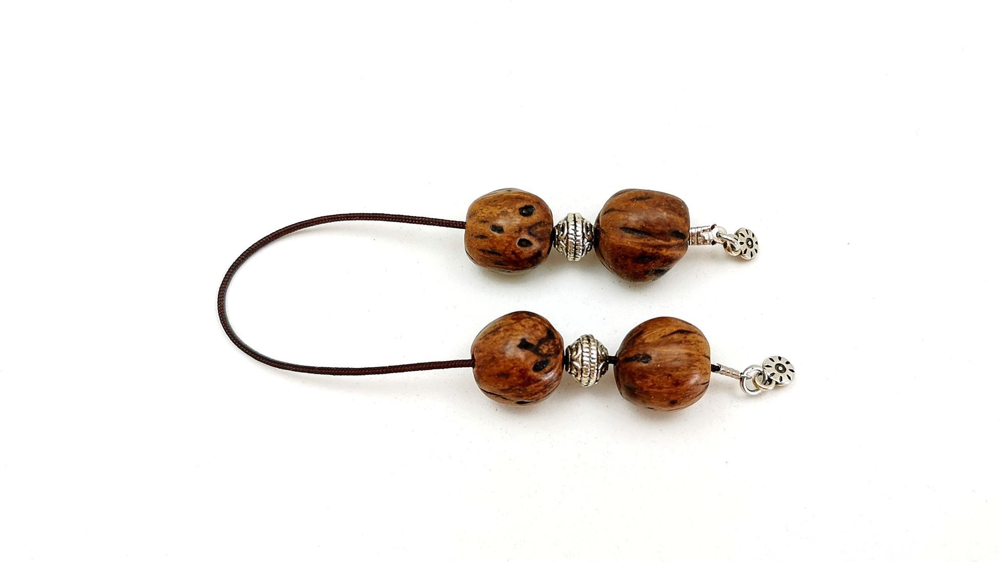 Μπεγλέρι από μοσχοκάρυδο αρωματικό,μέγεθος χάντρας ακανόνιστο στολισμένο με μεταλλικά στοιχεία.Παραδίδεται σε ημιδιάφανο πουγκάκι οργάντζας με καρτελάκι που αναφέρει τι υλικό είναι, σε Ελληνικά – Αγγλικά.