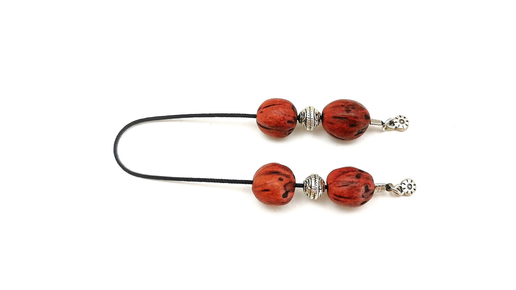 Μπεγλέρι από μοσχοκάρυδο αρωματικό,μέγεθος χάντρας ακανόνιστο,στολισμένο με μεταλλικά στοιχεία.Παραδίδεται σε ημιδιάφανο πουγκάκι οργάντζας με καρτελάκι που αναφέρει τι υλικό είναι, σε Ελληνικά – Αγγλικά.