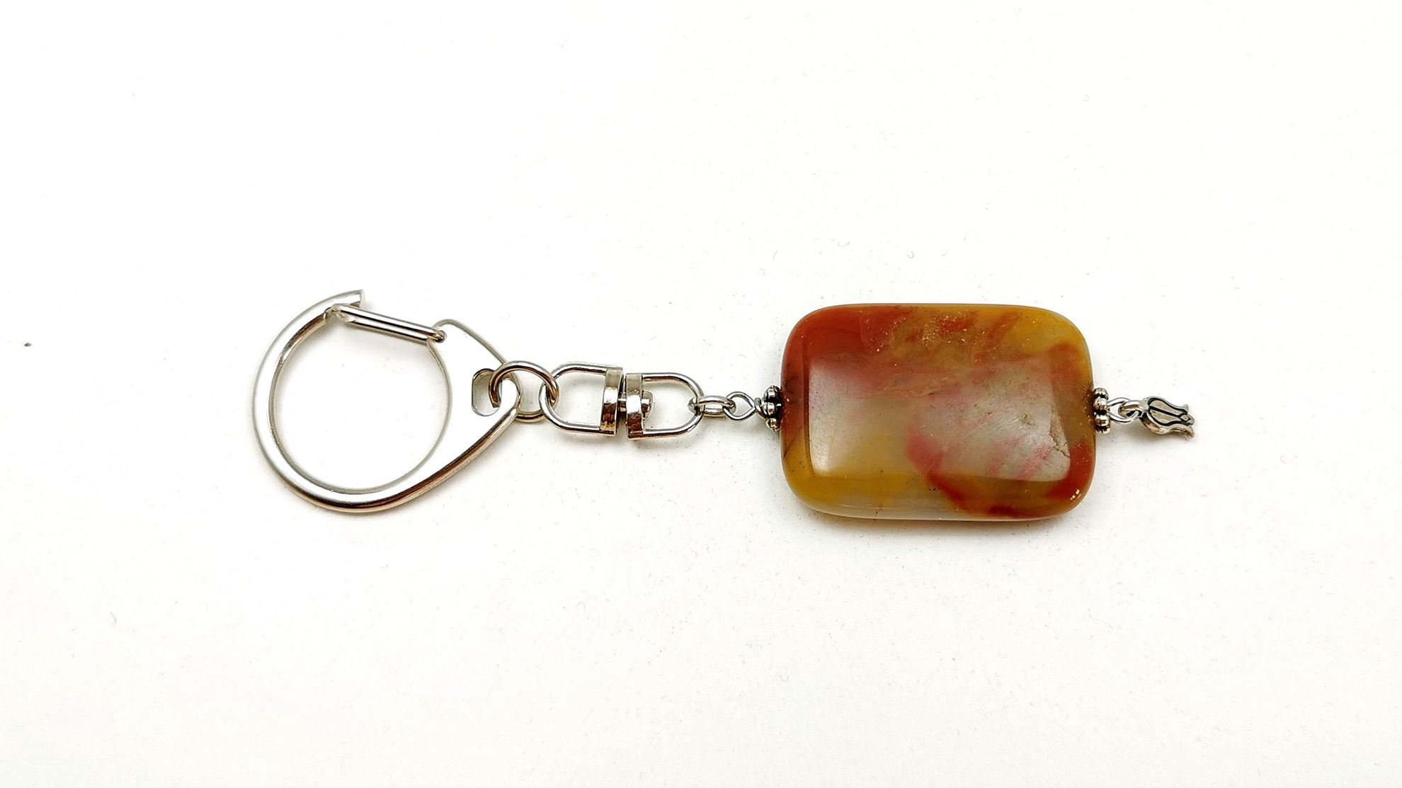 Μπρελόκ από Ίασπη, μέγεθος χάντρας ακανόνιστο, στολισμένο με μεταλλικά στοιχεία. Παραδίδεται σε ημιδιάφανο πουγκάκι οργάντζας με καρτελάκι που αναφέρει το υλικό σε Ελληνικά – Αγγλικά.
