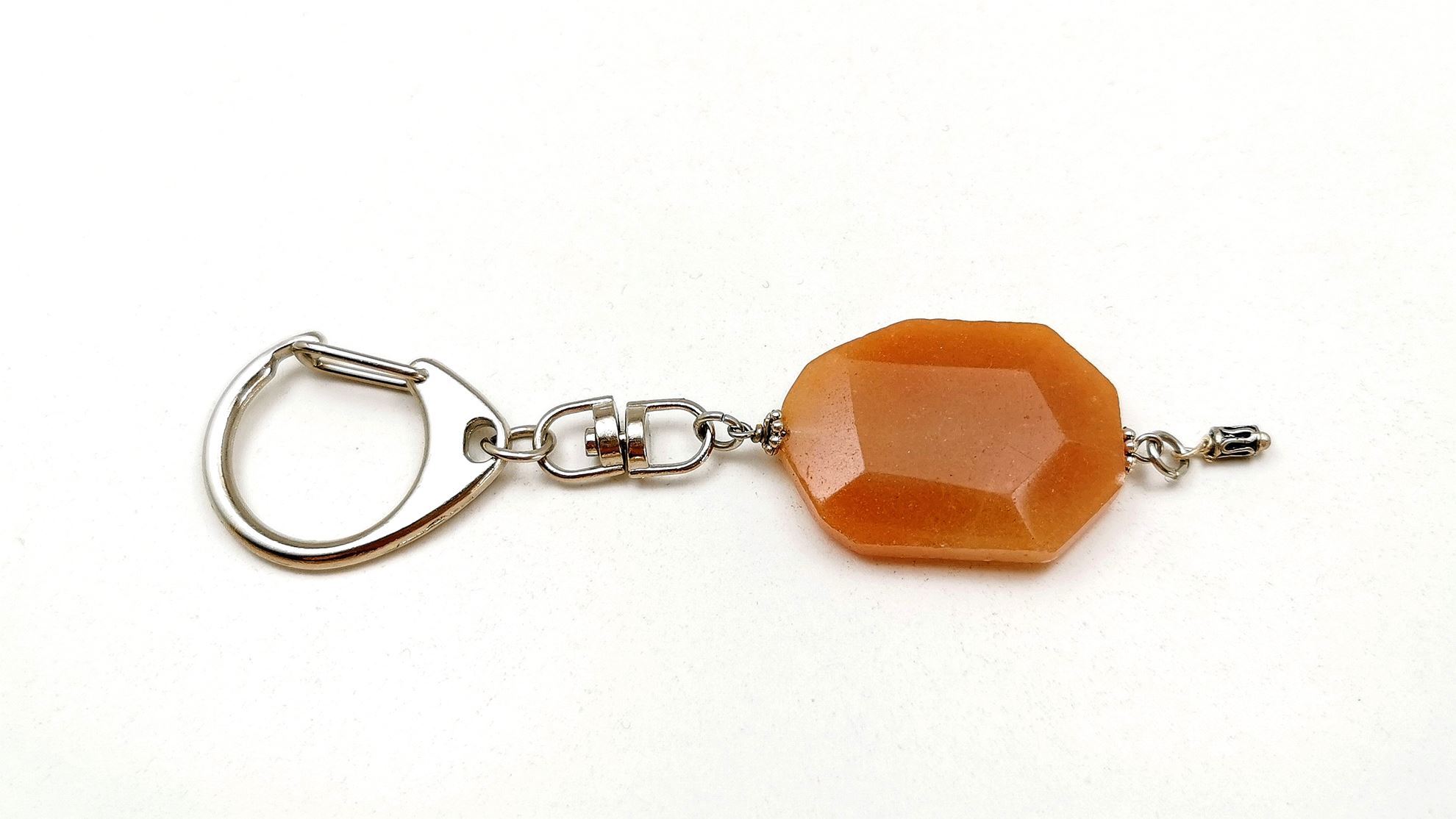 Μπρελόκ από Αβεντουρίνη, μέγεθος ακανόνιστο στολισμένο με μεταλλικά στοιχεία. Παραδίδεται σε ημιδιάφανο πουγκάκι οργάντζας με καρτελάκι που αναφέρει το υλικό σε Ελληνικά – Αγγλικά.