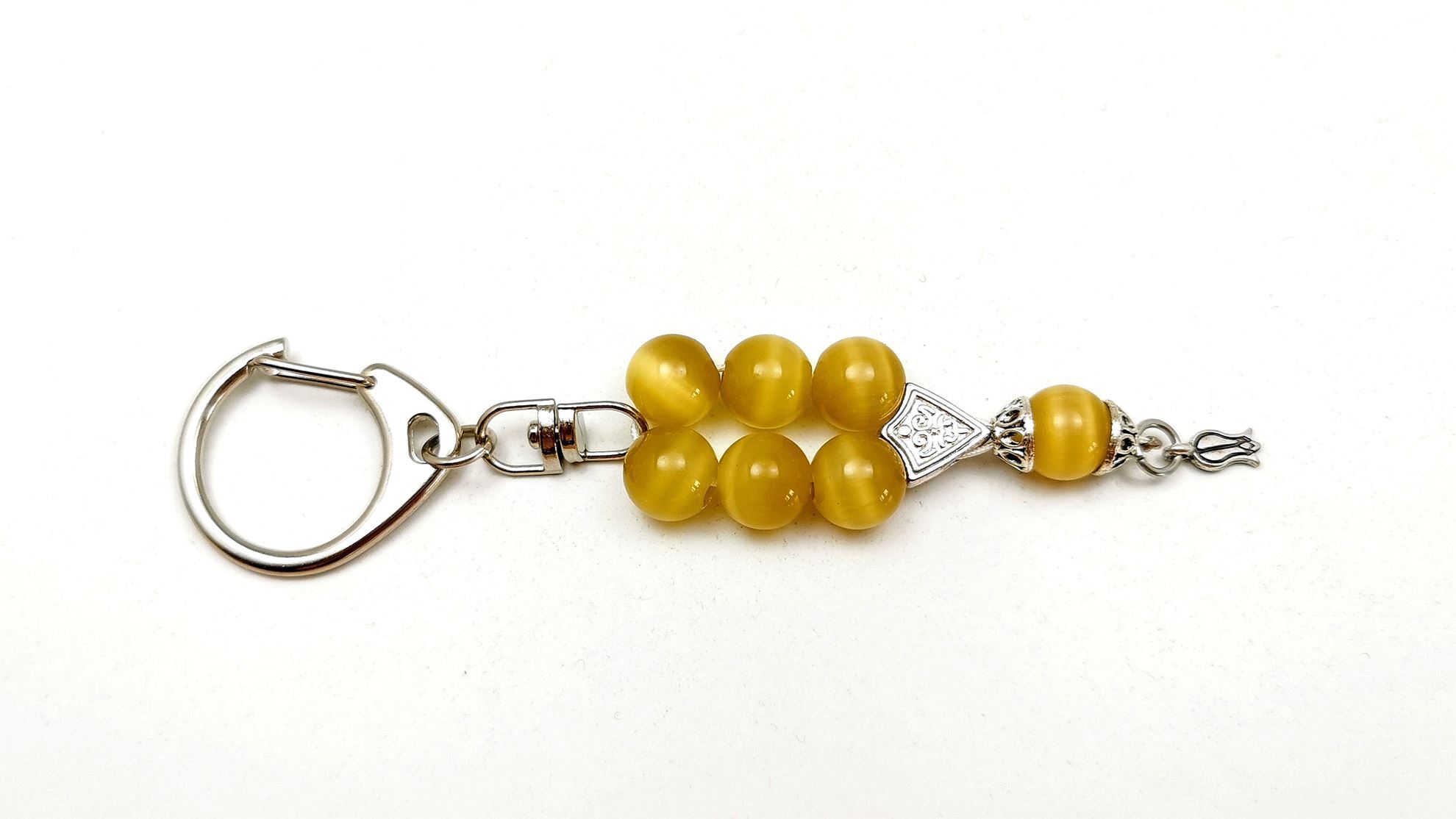 Μπρελόκ από Μάτι Γάτας, μέγεθος χάντρας 10mm, στολισμένο με μεταλλικά στοιχεία. Παραδίδεται σε ημιδιάφανο πουγκάκι οργάντζας με καρτελάκι που αναφέρει το υλικό σε Ελληνικά – Αγγλικά.