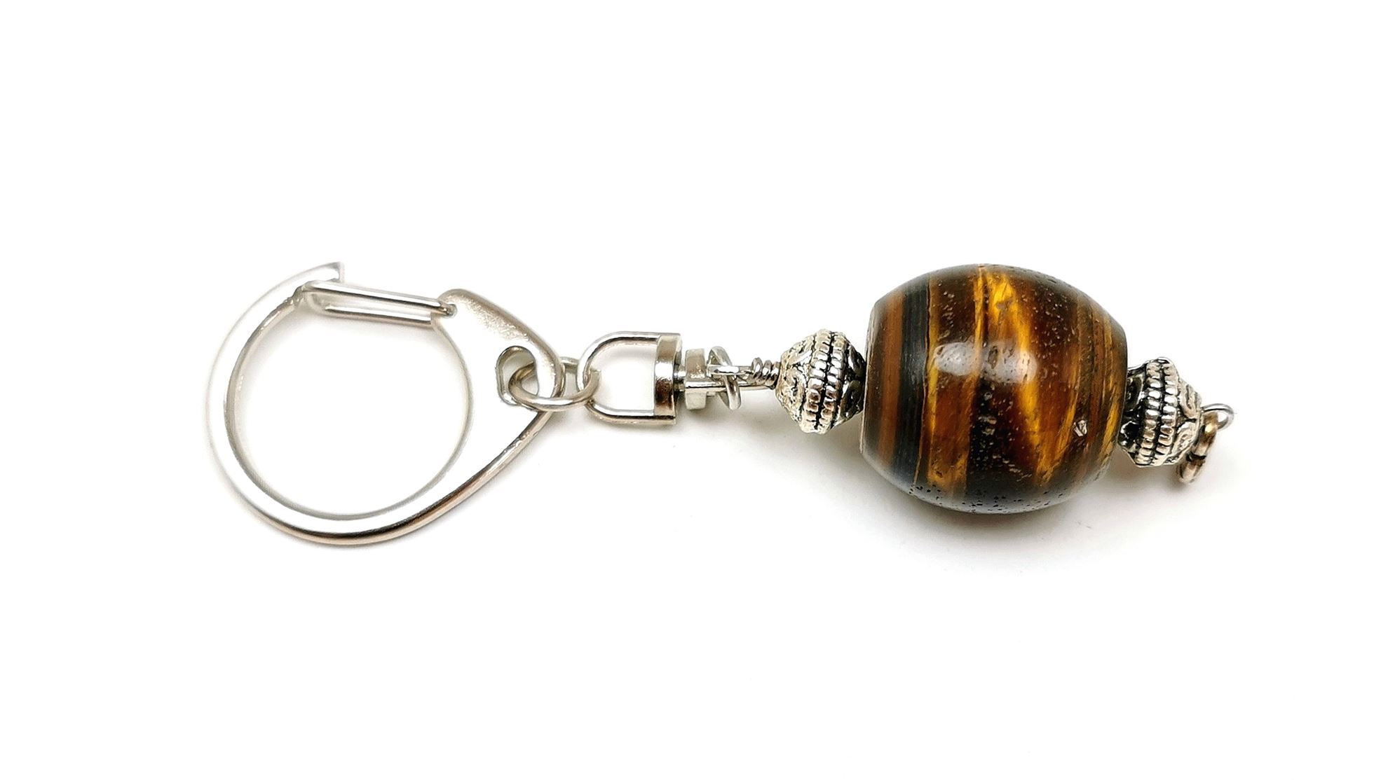 Μπρελόκ από Μάτι Τίγρης, μέγεθος χάντρας 20x20mm, στολισμένο με μεταλλικά στοιχεία. Παραδίδεται σε ημιδιάφανο πουγκάκι οργάντζας με καρτελάκι που αναφέρει το υλικό σε Ελληνικά – Αγγλικά.