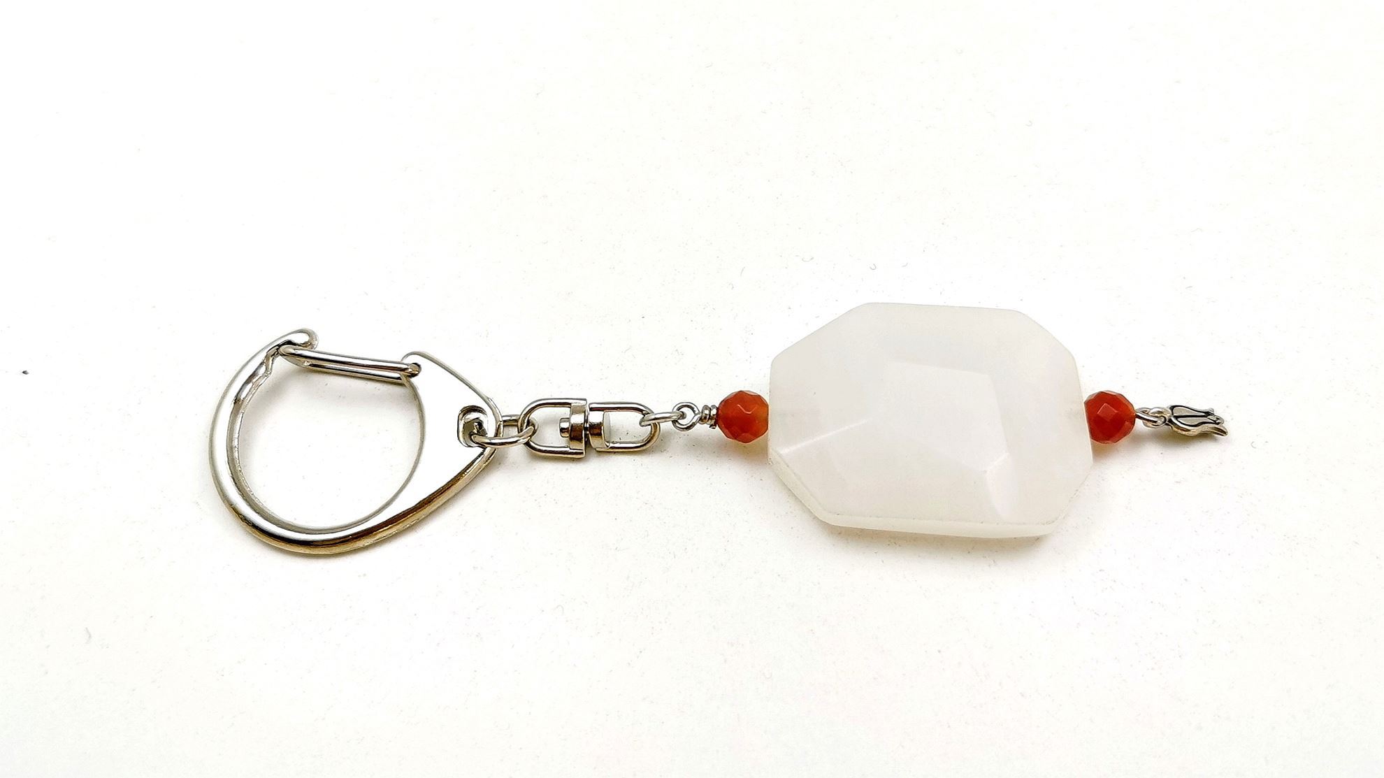 Μπρελόκ από Νεφρίτη, μέγεθος ακανόνιστο, στολισμένο με Αχάτη 6mm και με μεταλλικά στοιχεία. Παραδίδεται σε ημιδιάφανο πουγκάκι οργάντζας με καρτελάκι που αναφέρει το υλικό σε Ελληνικά – Αγγλικά.