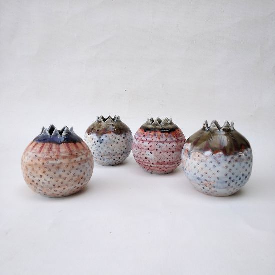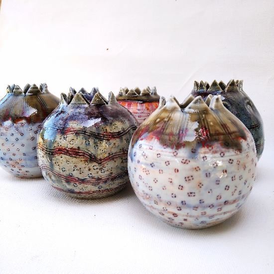 Από stoneware ή/και πορσελάνη. Διαστάσεις: 9 (ύψος) x 4 Βάρος: 300 gr. Επισήμανση ιδιαιτεροτήτων: αναγωγικό ψήσιμο σε καμίνι υγραερίου, διακόσμηση εξ ολοκλήρου ζωγραφισμένη στο χέρι, διάφορα χρώματα και σχέδια.