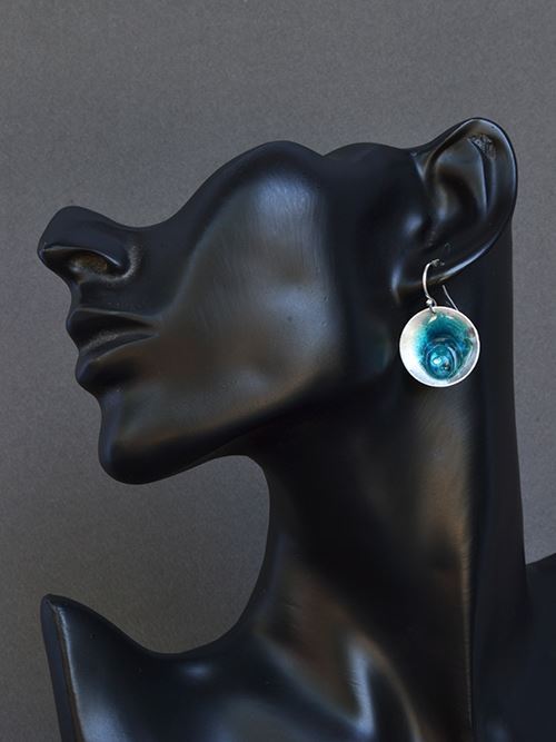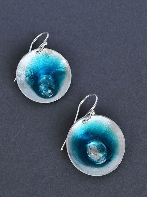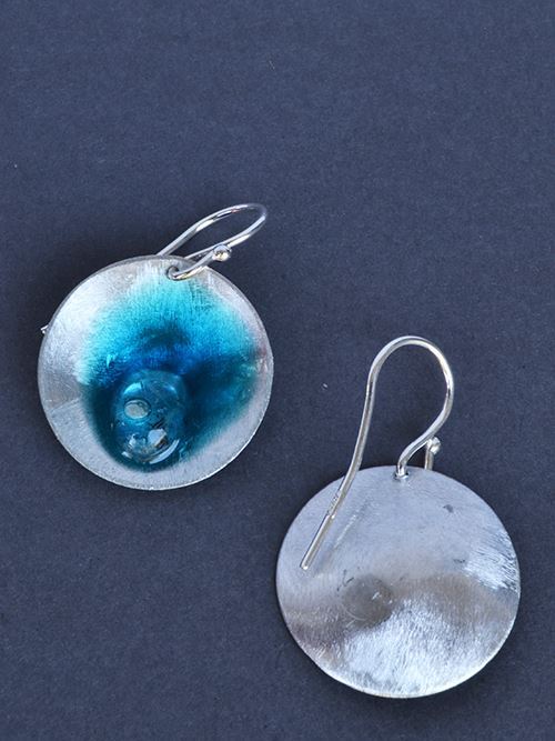 Χειροποίητα σκουλαρίκια από αλουμίνιο με ρητίνη και ψημένο γυαλί. Διάμετρος 2cm. Το γαντζάκι είναι ασημένιο. Υπάρχει η δυνατότητα να κατασκευαστεί και σε ασήμι 925.