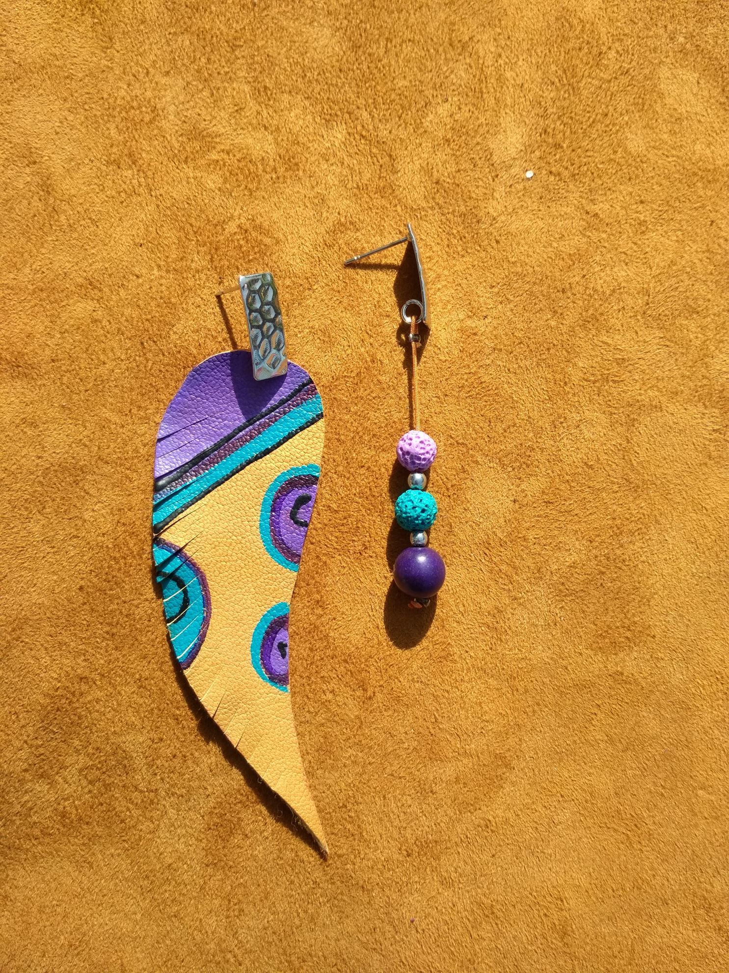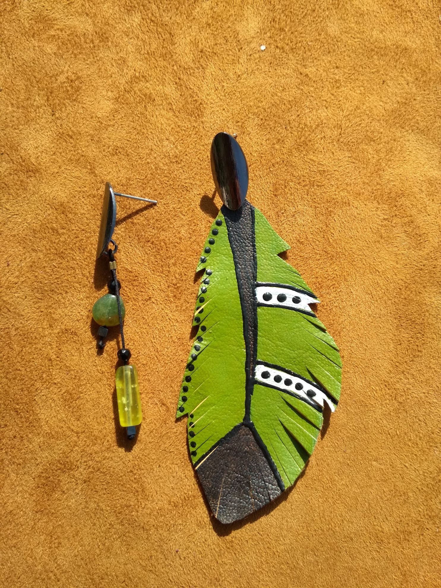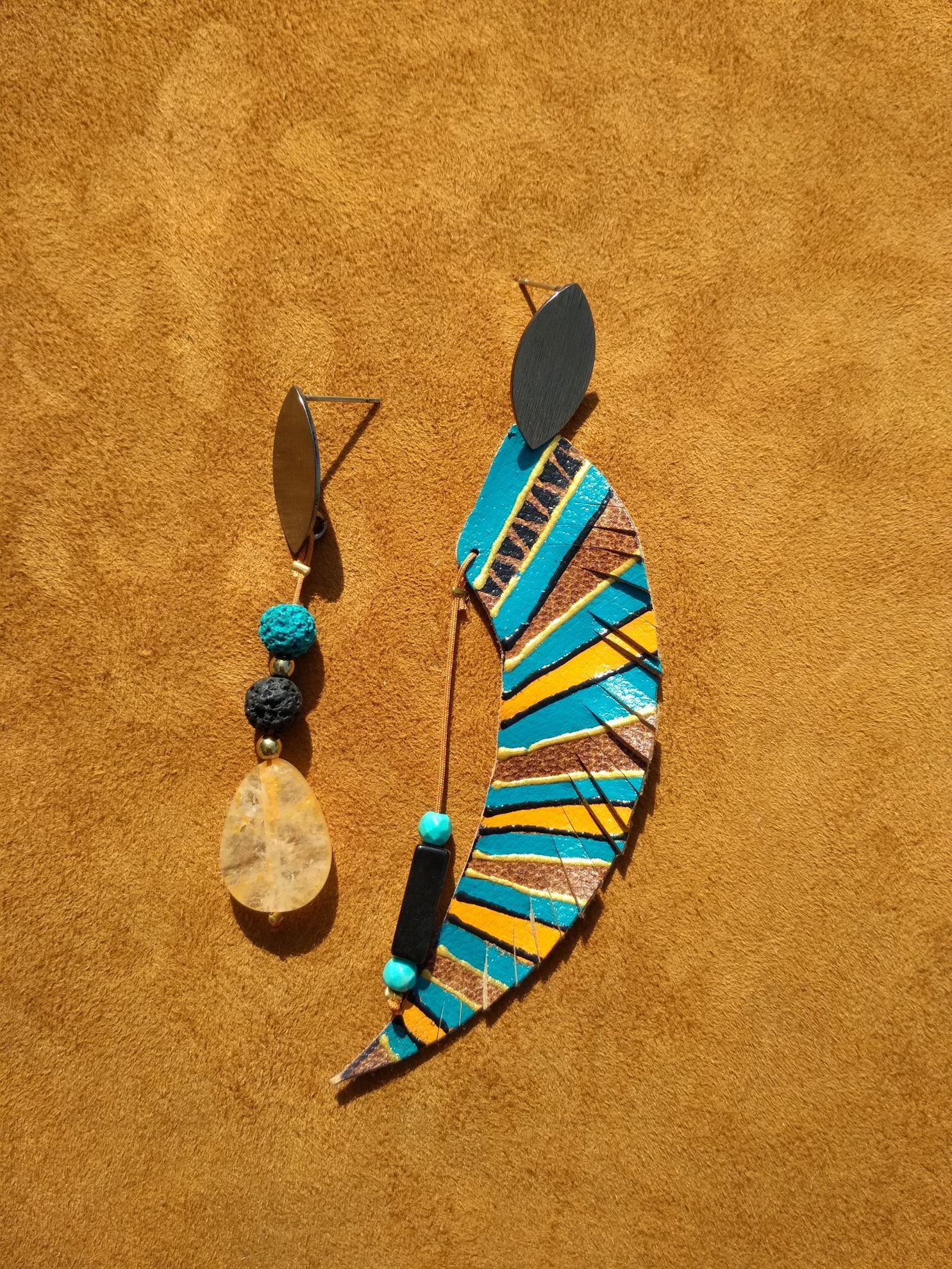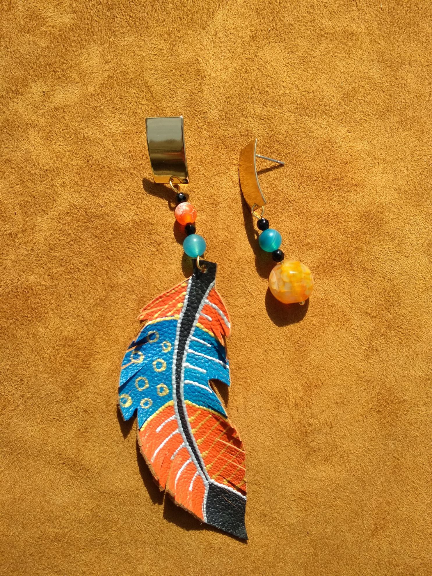 Σκουλαρίκι δερμάτινο ζωγραφισμένο και κομμένο στο χέρι στο σχήμα του φτερού. Το κάθε σκουλαρίκι στο ζευγάρι είναι διαφορετικό. Το ένα αποτελείται από δερμάτινο φτερό και το άλλο από ημιπολύτιμες πέτρες ή φυσικό φτερό μικρό, συνδυασμένα στο χρώμα της ζωγραφικής του φτερού. Ύψος φτερού: από 6,5 εκ. ύψος έως 8 εκ. Διατίθεται σε πολλούς διαφορετικούς χρωματικούς συνδυασμούς, σχήματα φτερών και τεχνικών στοιχείων. Τα μεταλλικά στοιχεία είναι υποαλλεργικά ή ατσάλινα, ή ασημένια. Το κάθε κόσμημα είναι μοναδικό και μπορούμε να σας στείλουμε φωτογραφίες από όλα τα υπάρχοντα σχέδια και χρώματα ώστε να διαλέξετε αυτά που επιθυμείτε.