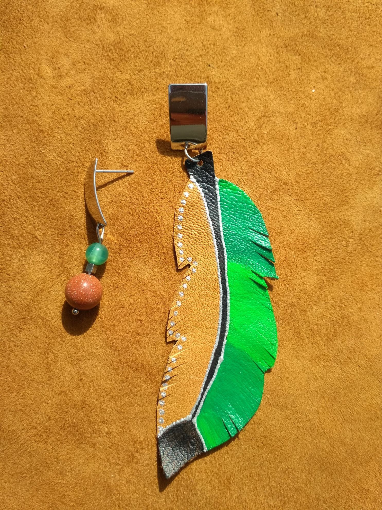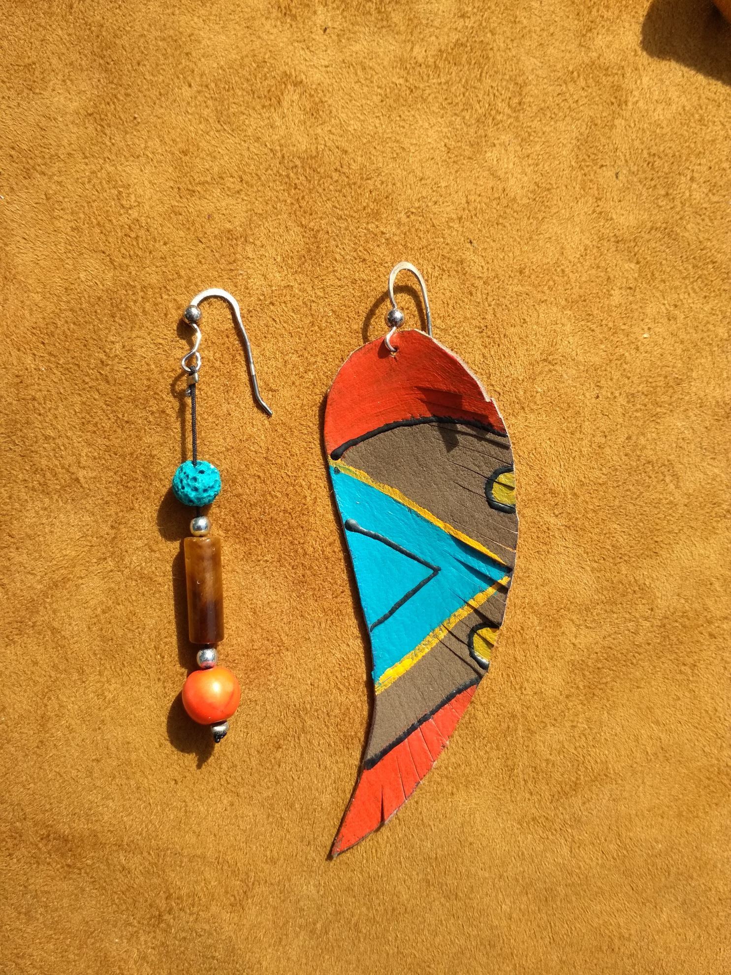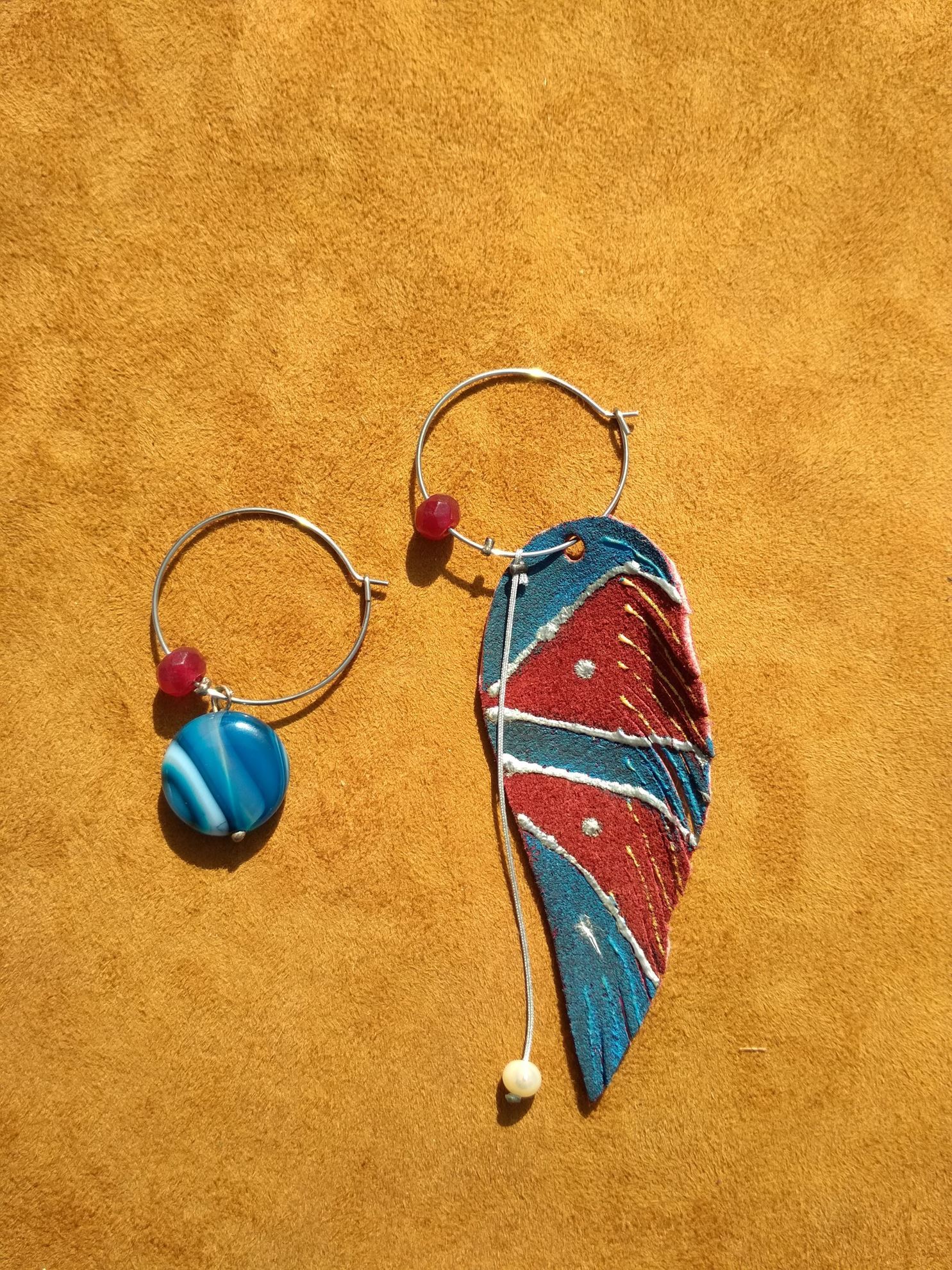 Σκουλαρίκι δερμάτινο ζωγραφισμένο και κομμένο στο χέρι στο σχήμα του φτερού. Το κάθε σκουλαρίκι στο ζευγάρι είναι διαφορετικό. Το ένα αποτελείται από δερμάτινο φτερό και το άλλο από ημιπολύτιμες πέτρες ή φυσικό φτερό μικρό, συνδυασμένα στο χρώμα της ζωγραφικής του φτερού. Ύψος φτερού: από 6,5 εκ. ύψος έως 8 εκ. Διατίθεται σε πολλούς διαφορετικούς χρωματικούς συνδυασμούς, σχήματα φτερών και τεχνικών στοιχείων. Τα μεταλλικά στοιχεία είναι υποαλλεργικά ή ατσάλινα, ή ασημένια. Το κάθε κόσμημα είναι μοναδικό και μπορούμε να σας στείλουμε φωτογραφίες από όλα τα υπάρχοντα σχέδια και χρώματα ώστε να διαλέξετε αυτά που επιθυμείτε.