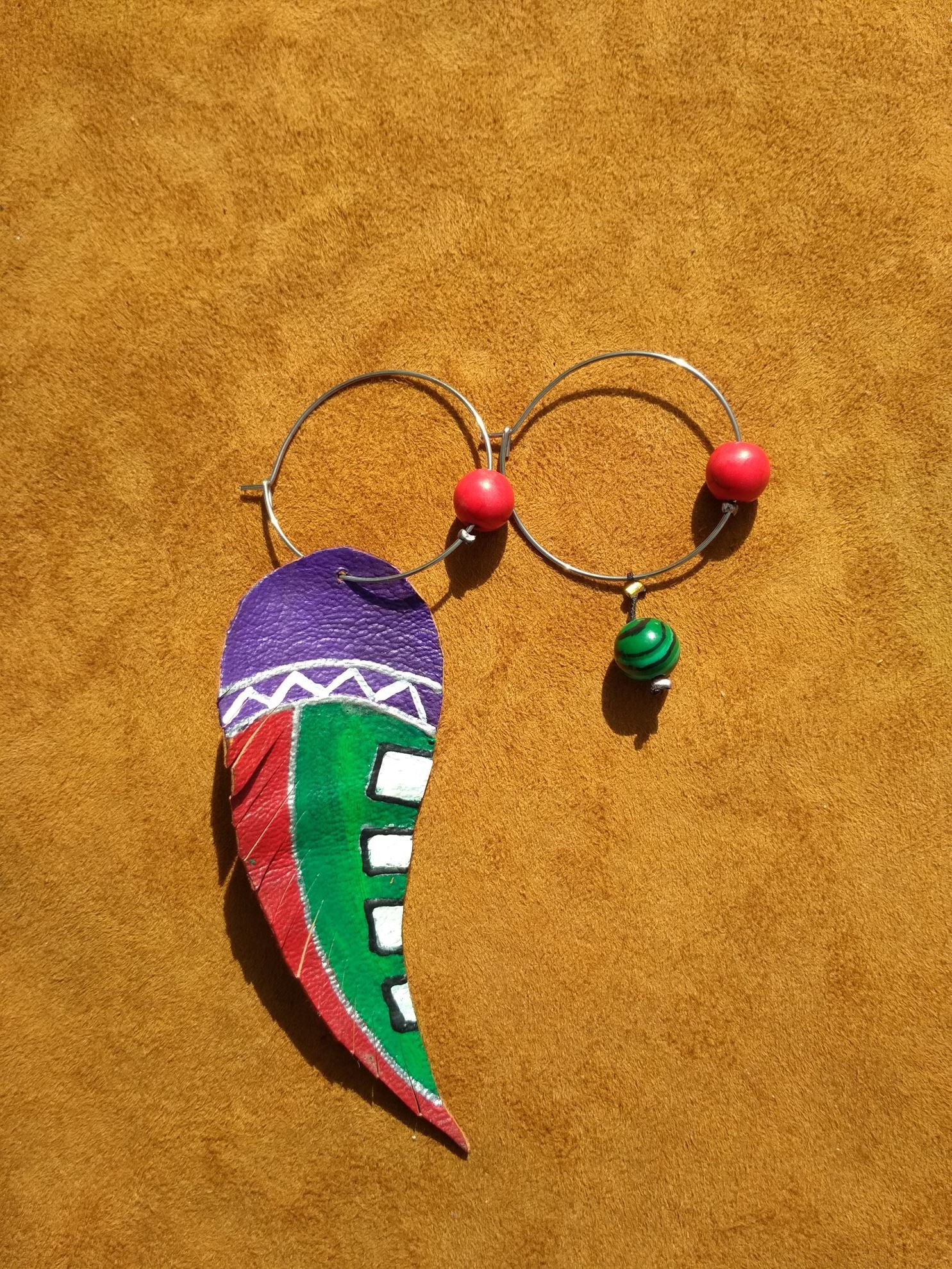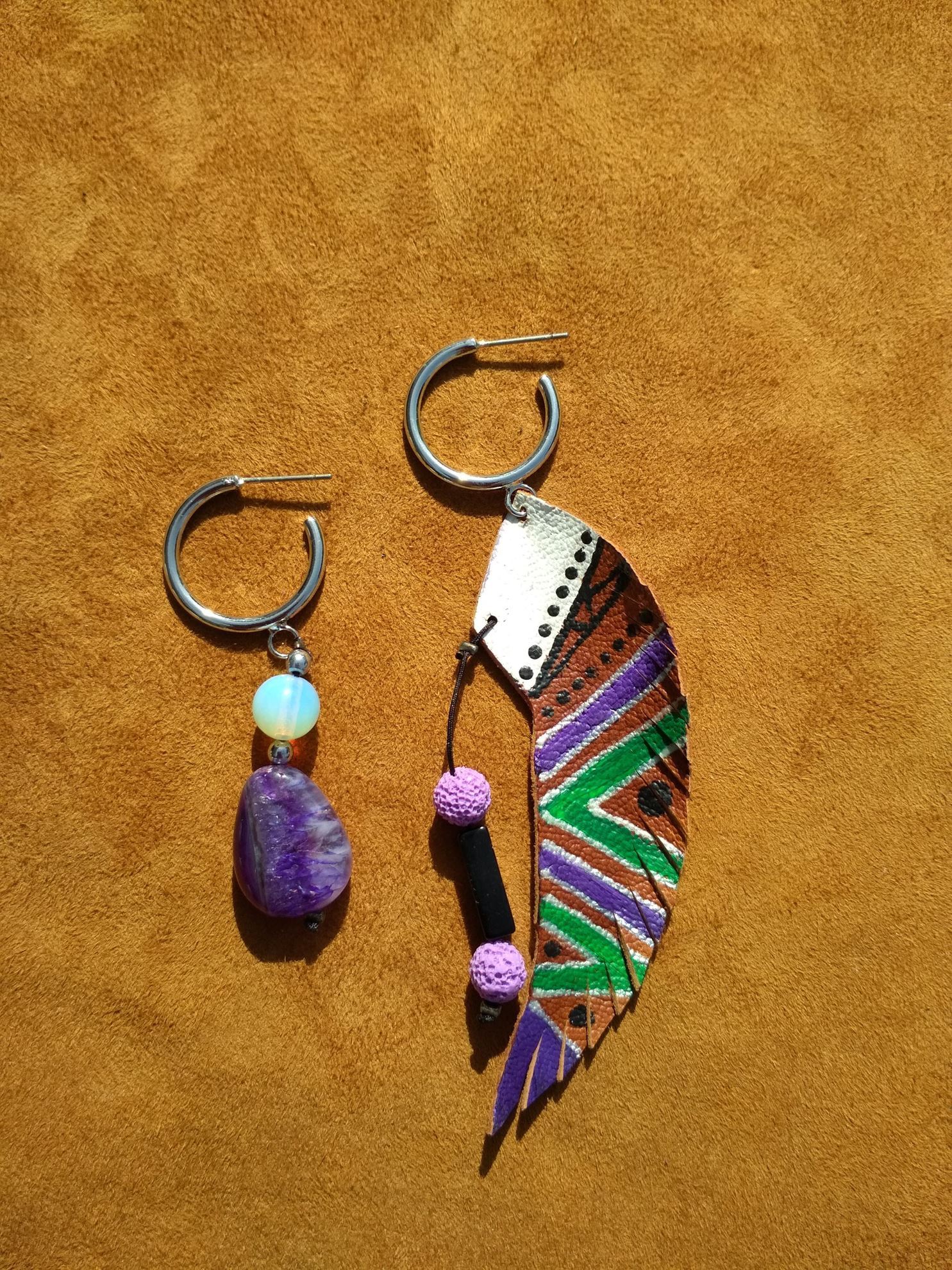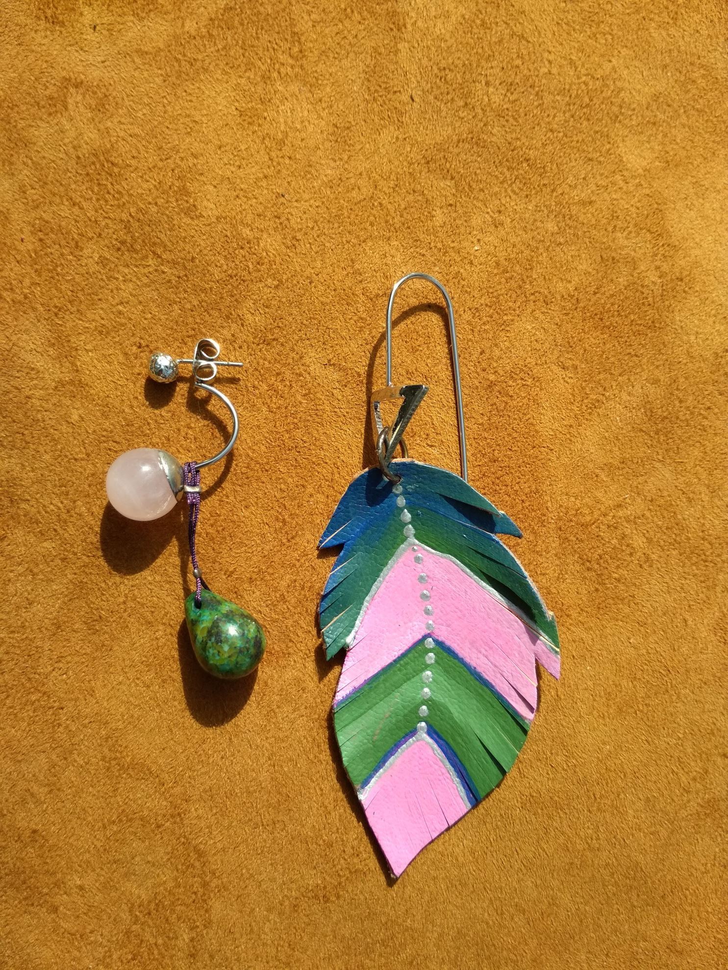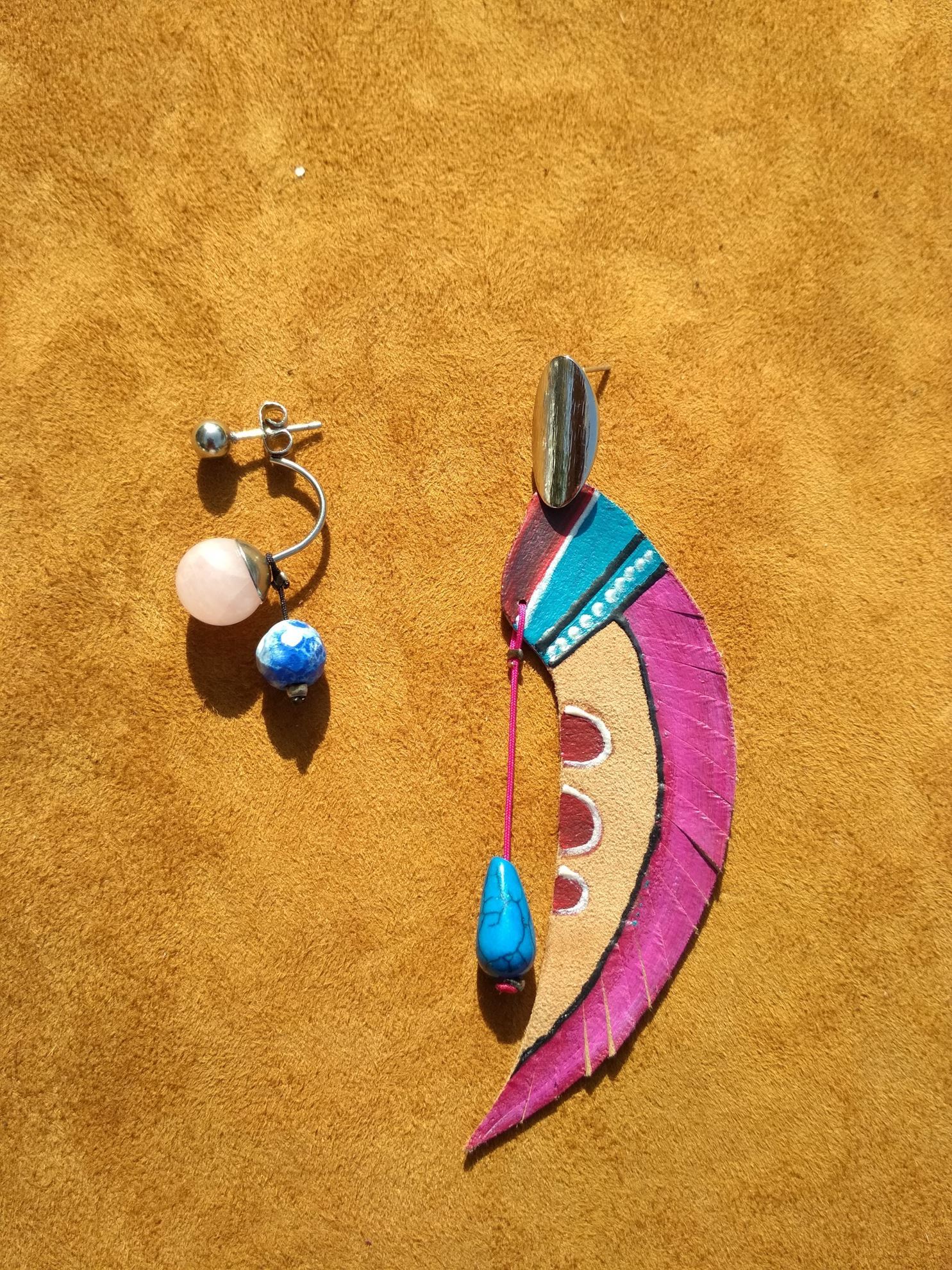 Σκουλαρίκι δερμάτινο ζωγραφισμένο και κομμένο στο χέρι στο σχήμα του φτερού. Το κάθε σκουλαρίκι στο ζευγάρι είναι διαφορετικό. Το ένα αποτελείται από δερμάτινο φτερό και το άλλο από ημιπολύτιμες πέτρες ή φυσικό φτερό μικρό, συνδυασμένα στο χρώμα της ζωγραφικής του φτερού. Ύψος φτερού: από 6,5 εκ. ύψος έως 8 εκ. Διατίθεται σε πολλούς διαφορετικούς χρωματικούς συνδυασμούς, σχήματα φτερών και τεχνικών στοιχείων. Τα μεταλλικά στοιχεία είναι υποαλλεργικά ή ατσάλινα, ή ασημένια. Το κάθε κόσμημα είναι μοναδικό και μπορούμε να σας στείλουμε φωτογραφίες από όλα τα υπάρχοντα σχέδια και χρώματα ώστε να διαλέξετε αυτά που επιθυμείτε.