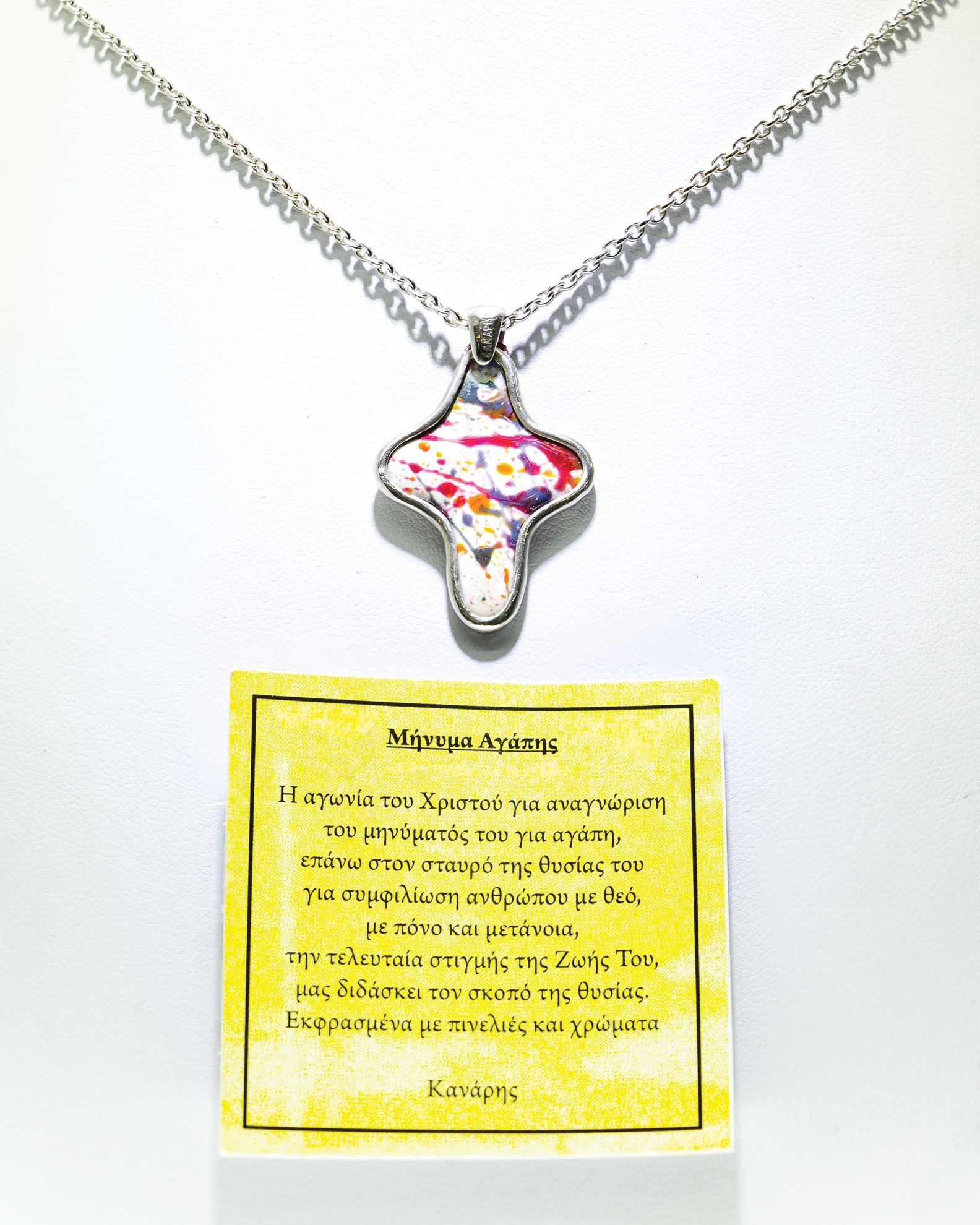 Μήνυμα Αγάπης. Η αγωνία του Χριστού για αναγνώριση του μηνυματός του για αγάπη , επάνω στον σταυρό της θυσίας του , για συμφιλίωση ανθρώπου με θεό , με πόνο και μετάνοια την τελευταία στιγμή της ζωής του ,μας διδάσκει τον σκοπό της θυσίας. Εκφρασμένα με πινελιές και χρώματα Καναρης