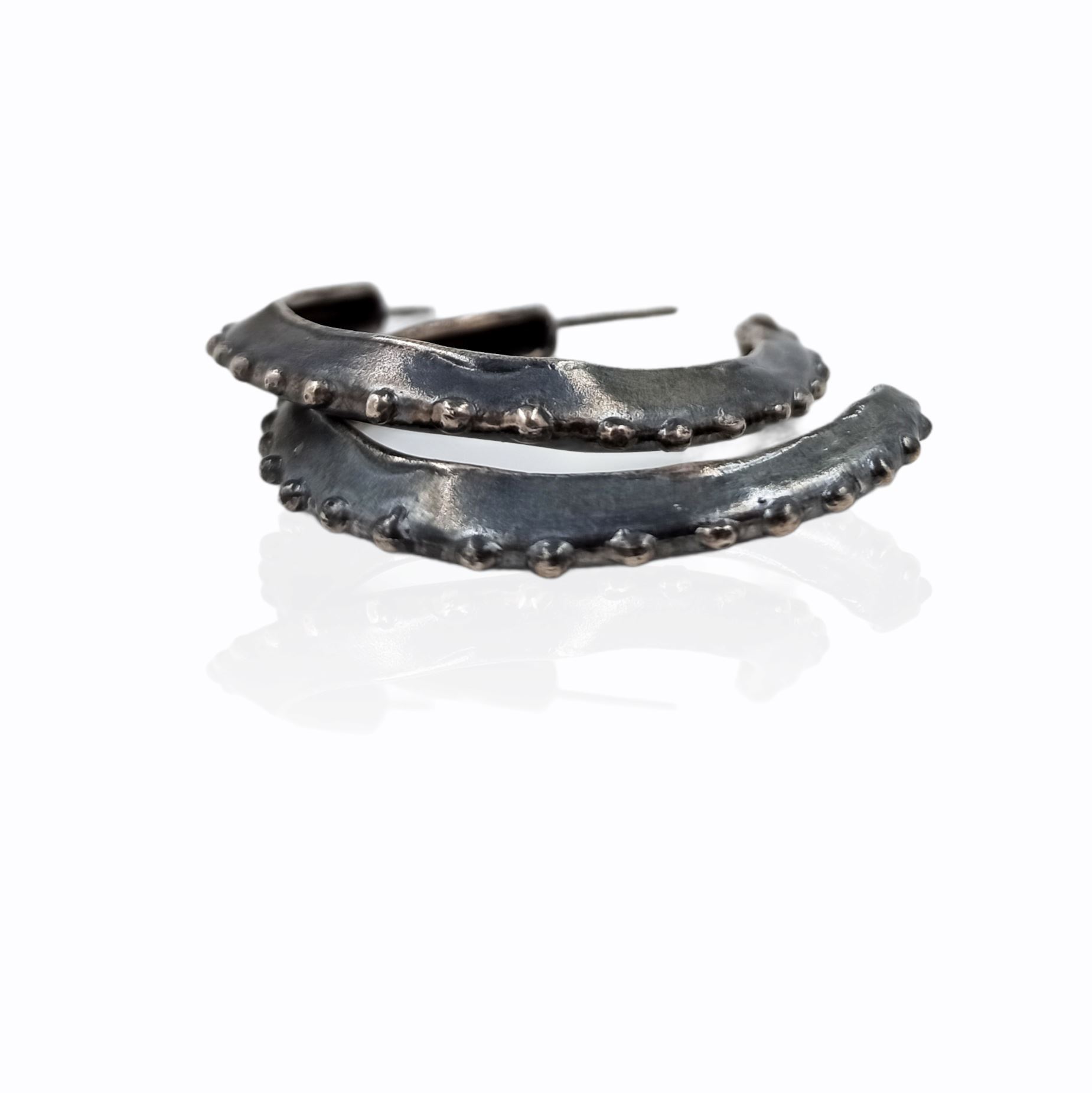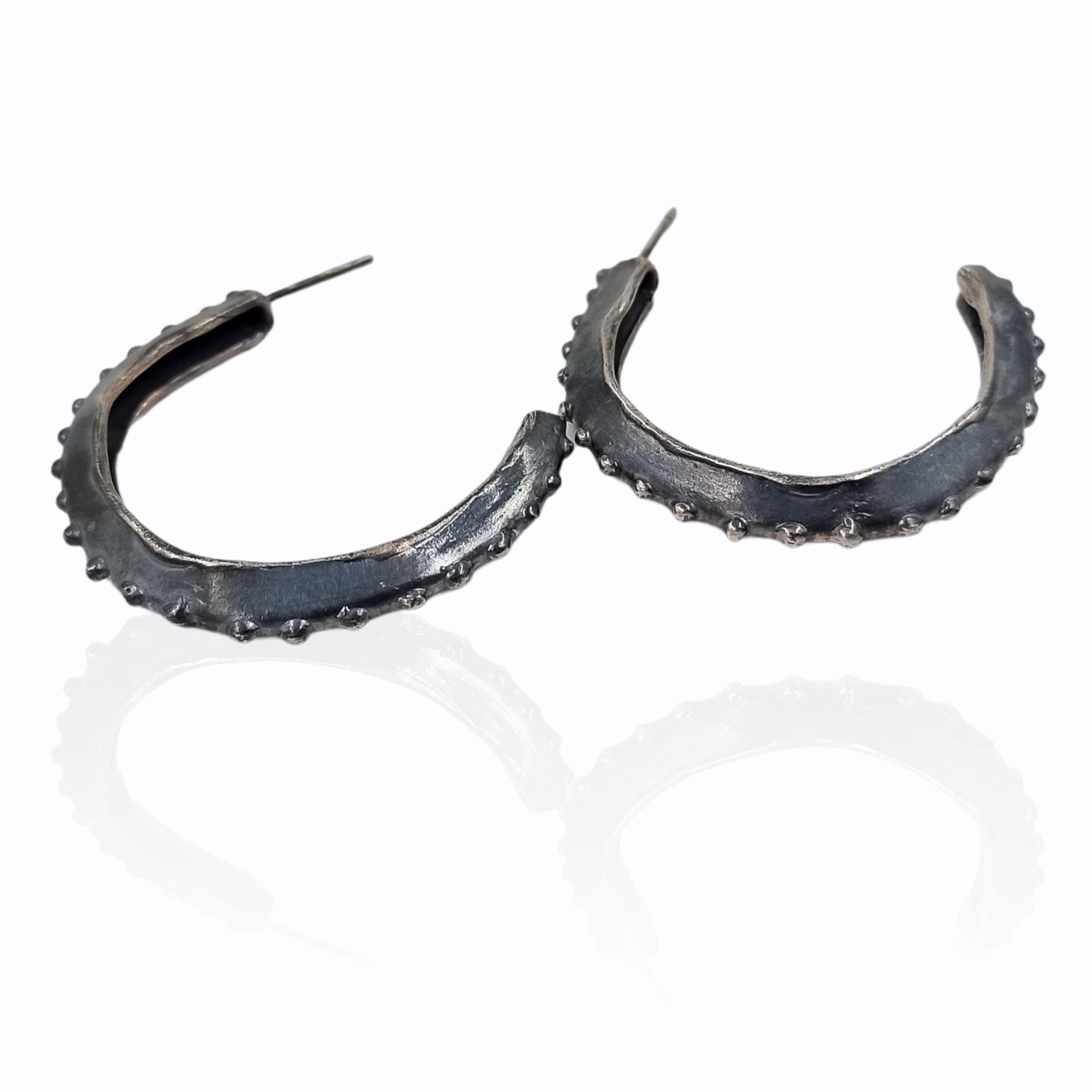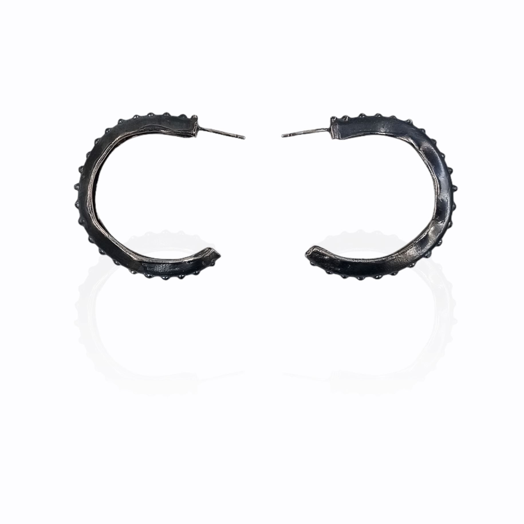Χειροποίητα σκουλαρίκια κρίκοι διακοσμημένα με ασημένιες μπίλιες. Έχει χρησιμοποιηθεί μαύρη οξείδωση για ένα πιο δραματικό αποτέλεσμα και ανάδειξη του σχεδίου. Μπορεί επίσης να κατασκευασθεί σε επιχρυσωμένο ή οξειδωμένο ορείχαλκο. ◆◆ Διαστάσεις Η διάμετρος των κρίκων είναι 3,50 εκ. ◆◆ Υλικά ♦ Ασήμι .925