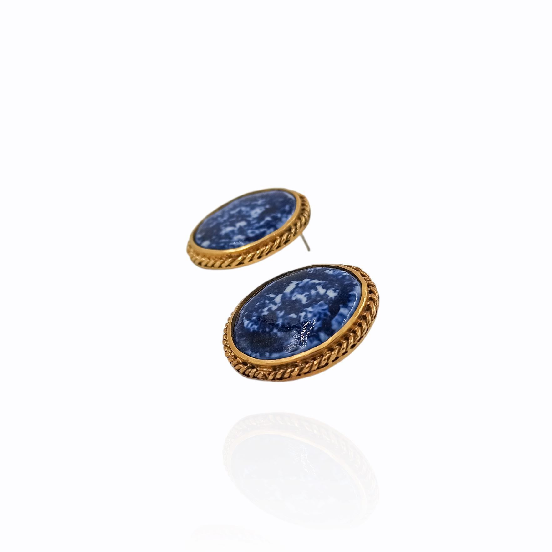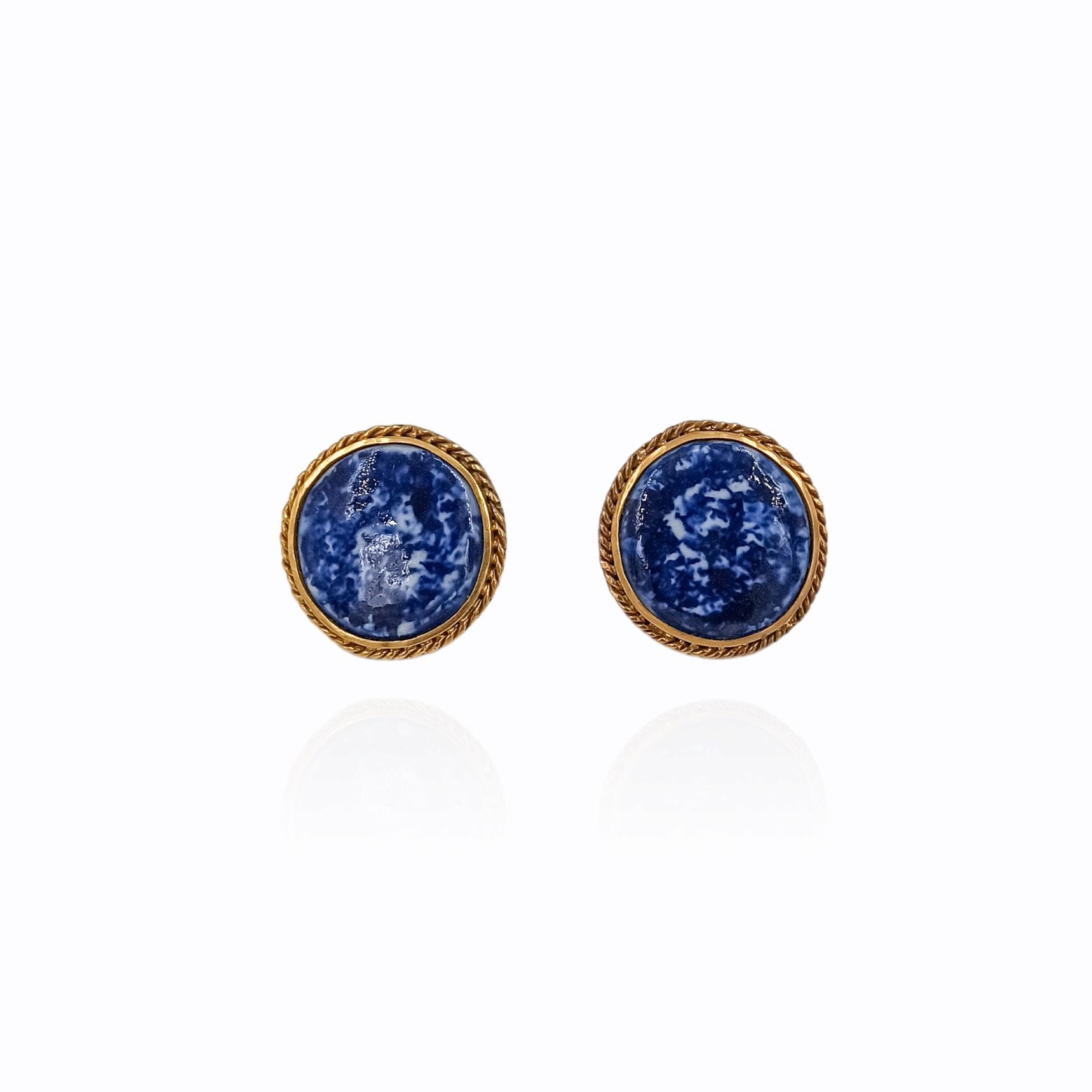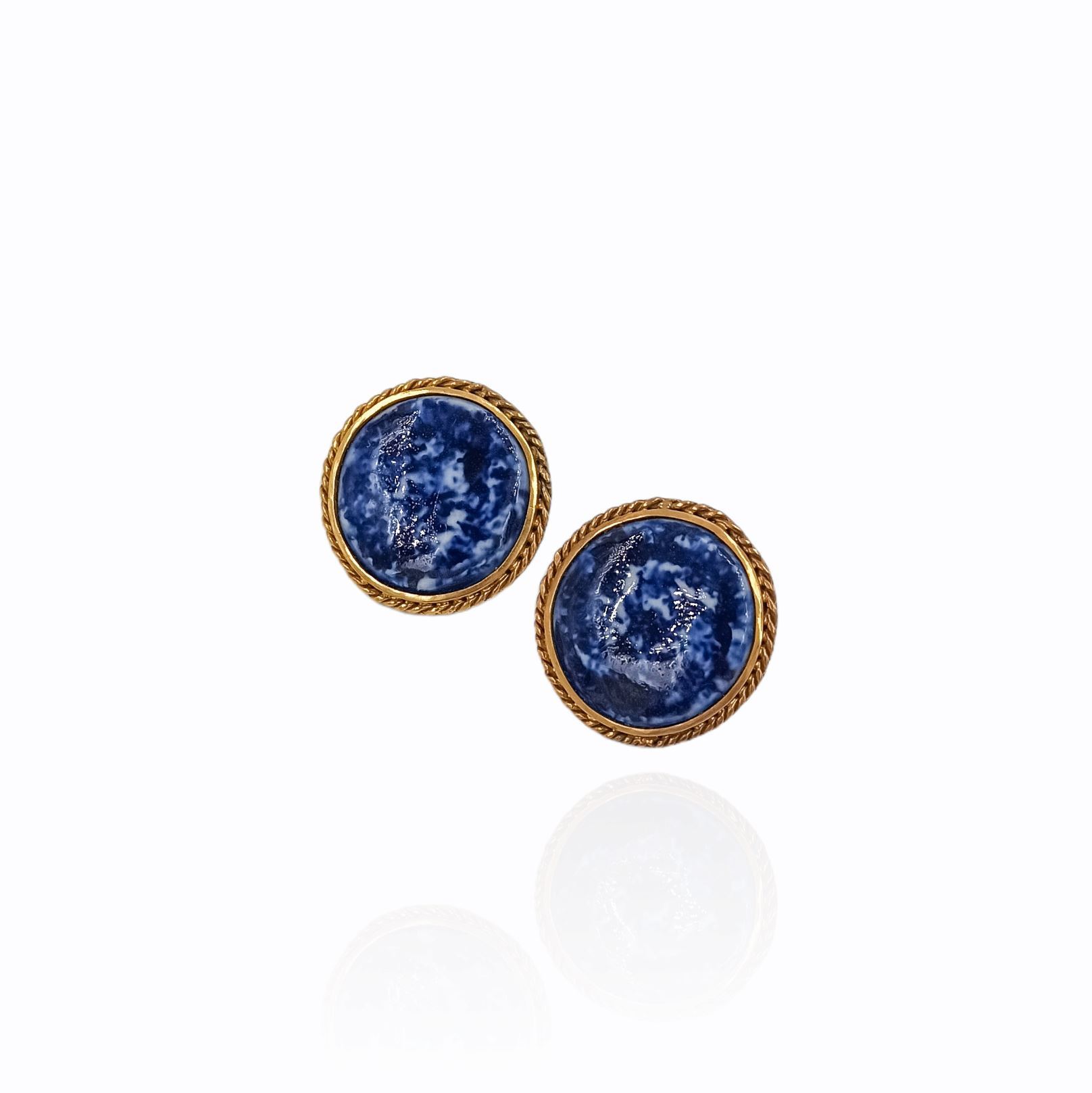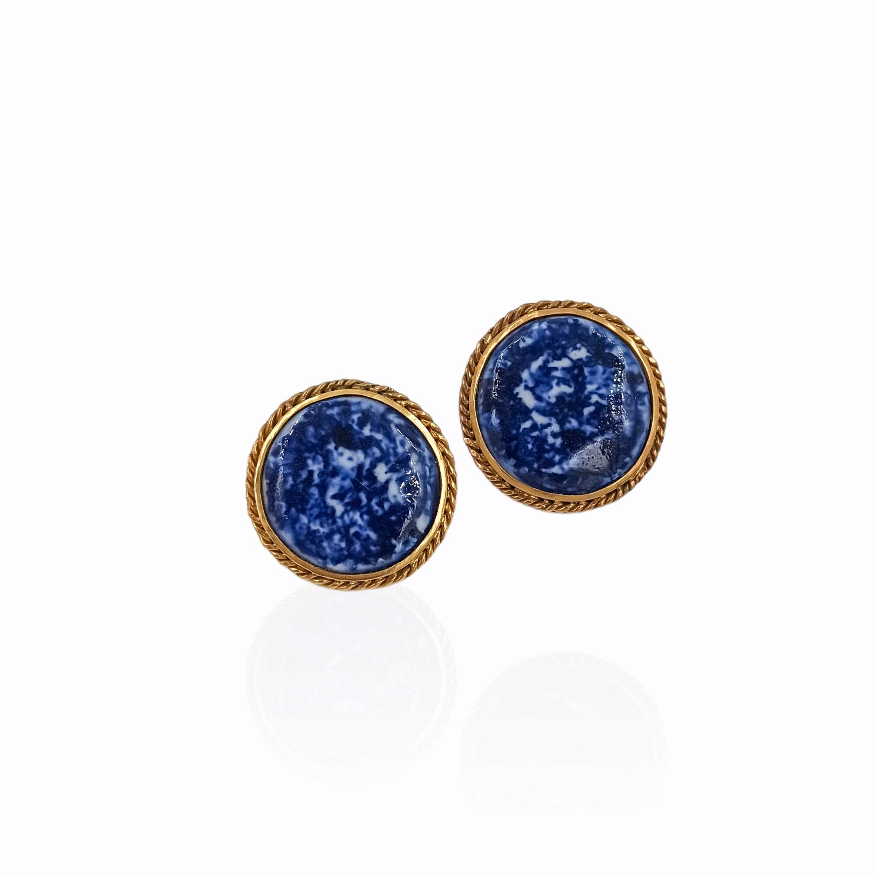 Ένα εντυπωσιακό ζευγάρι επιχρυσωμένα σκουλαρίκια με χειροποίητες πέτρες από πορσελάνη. Τα μέρη πορσελάνης ψήνονται δύο φορές σε κλίβανο υψηλής θερμοκρασίας (έως 1240oC). Για το τελικό αποτέλεσμα έχω χρησιμοποιήσει ειδικά χρώματα κεραμικής και διάφανο γυαλί. Παραδοσιακές τεχνικές και εργαλεία αργυροχοΐας έχουν χρησιμοποιηθεί για την δημιουργία τους. Μπορούν να κατασκευαστούν σε ασήμι 925 και σε διαφορετικά χρώματα. ◆◆Διαστάσεις ◆Διάμετρος πορσελάνης περίπου 2,70 εκατοστά. ◆ Συνολική διάμετρος με διακόσμηση περίπου 3,20 εκατοστά. ◆◆ Υλικά ◆ Ορείχαλκος επιχρυσωμένος ◆ Πορσελάνη ◆ Ασημένια .925 καρφάκια