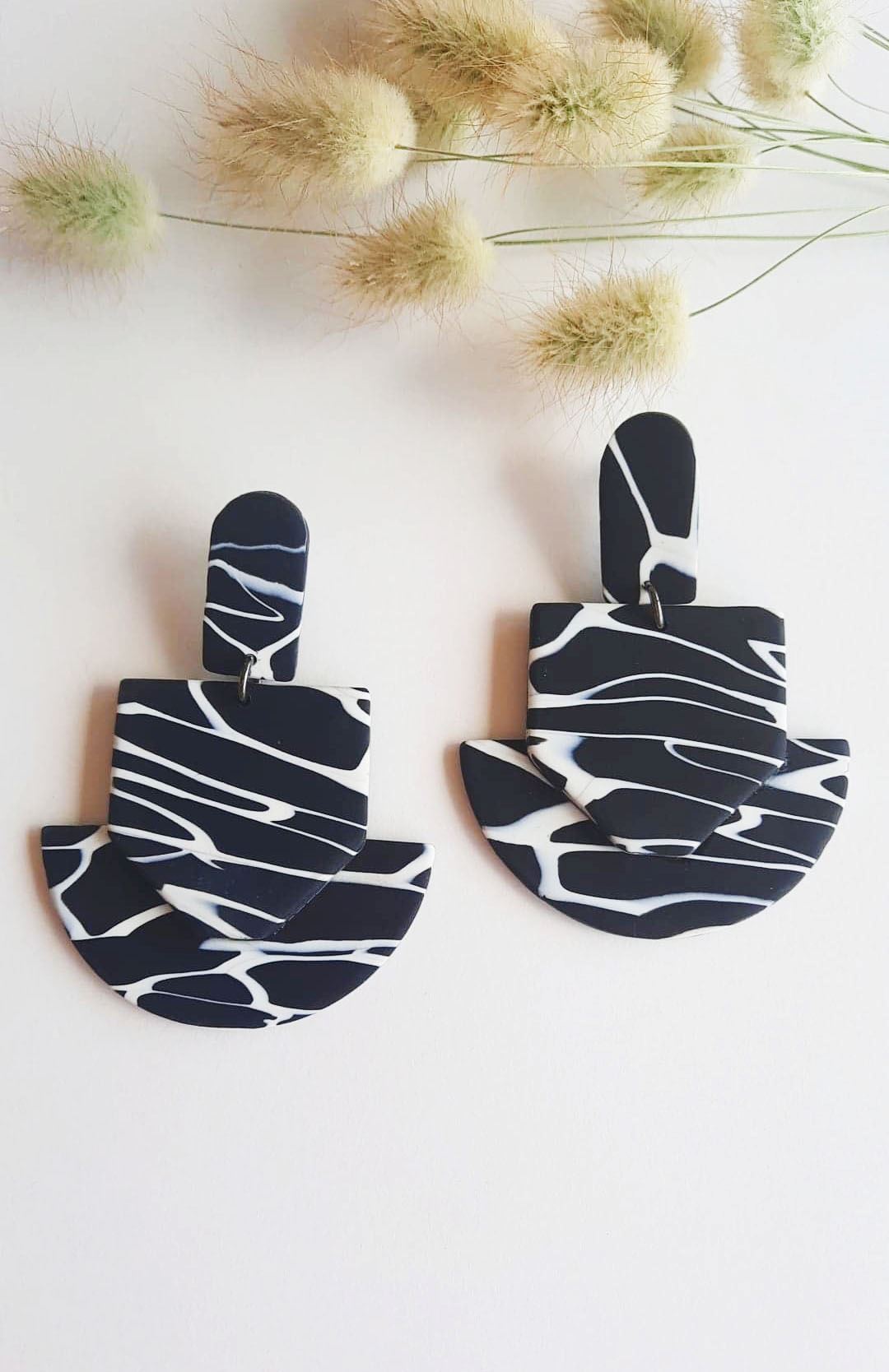 Ασπρόμαυρο μοντέρνο με minimal ύφος μακρύ σκουλαρίκι από πολυμερικο πηλό, πάρα πολύ ελαφρύ με επάργυρο η επίχρυσο κούμπωμα και ατσάλινο καρφάκι