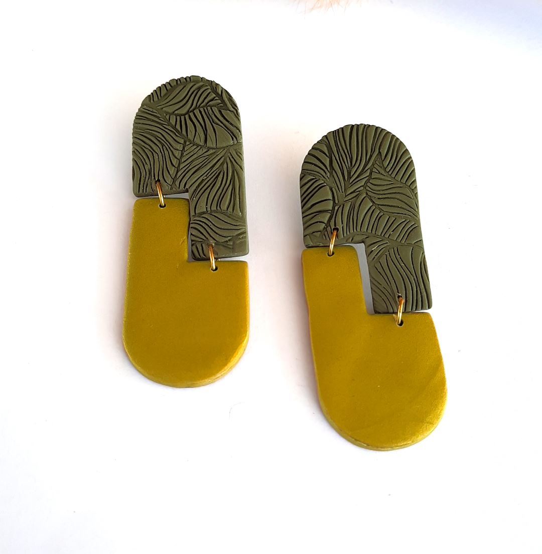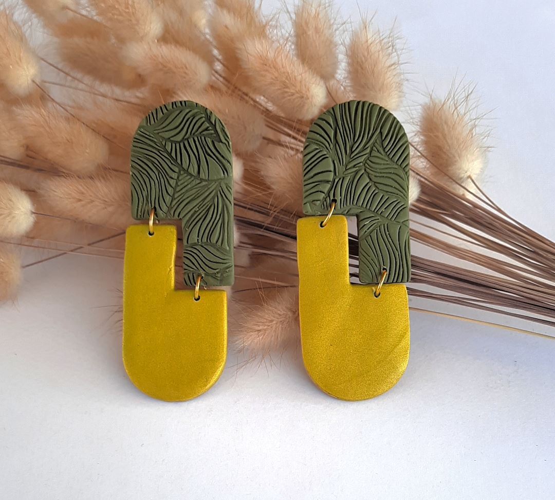 Χειροποίητα σκουλαρίκια από πολυμερικο πηλό, ελαφρώς εύκαμπτα που αποτελούνται από δυο μέρη το πάνω μέρος είναι ανάγλυφο σε λαδί χρώμα και το κάτω μέρος είναι μεταλλικό πλούσιο – χρυσό. Στο πίσω μέρος κλείνει με ατσάλινο καρφί και επίχριση η επάργυρη πεταλούδα.