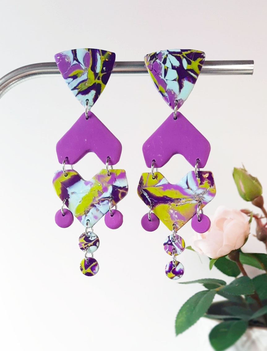 Εντυπωσιακά κρεμαστά γεωμετρικά σκουλαρίκια με την τεχνική Mocume από πολυμερικο πηλό, πάρα πολύ ελαφρύ με επάργυρο η επίχρυσο κούμπωμα και ατσάλινο καρφάκι.