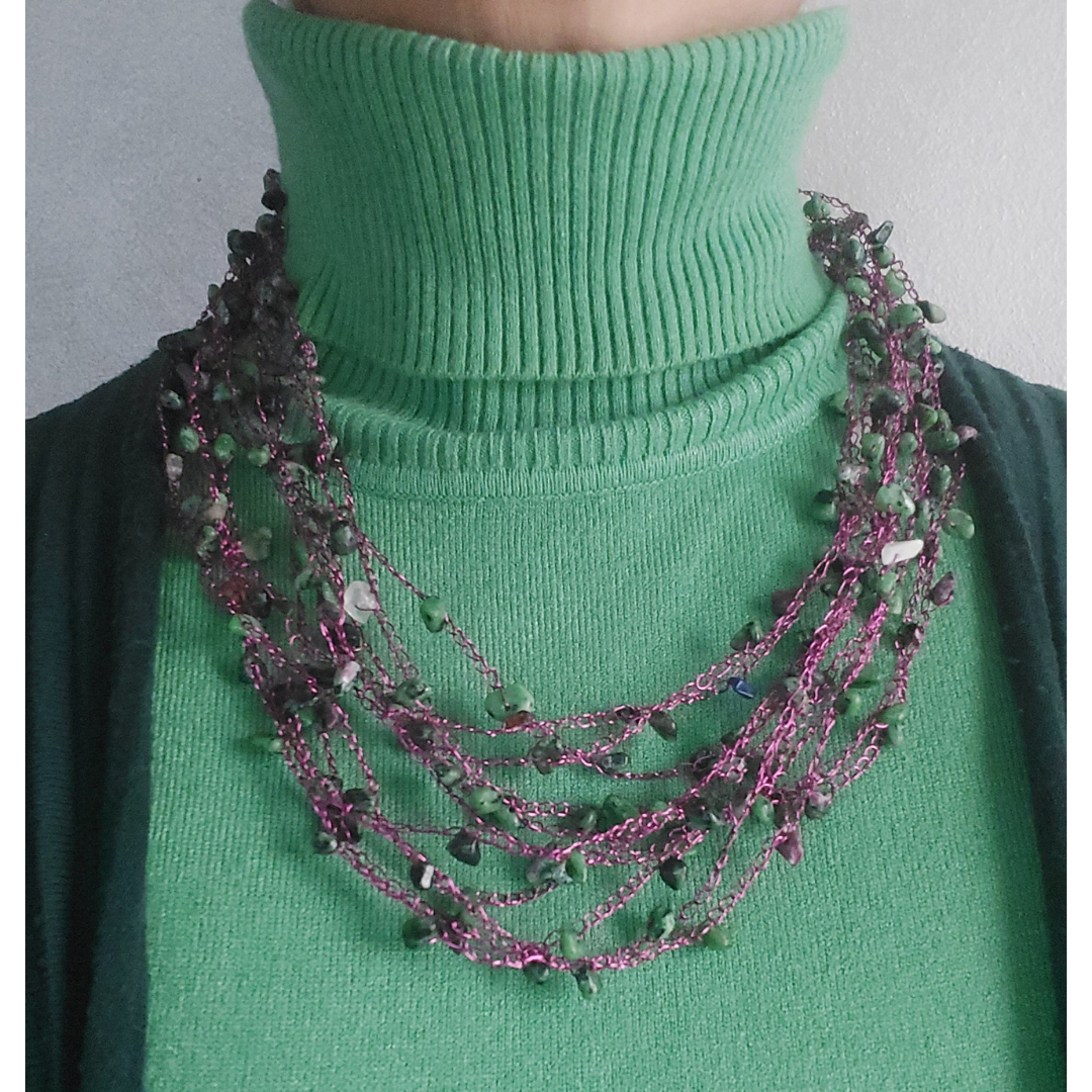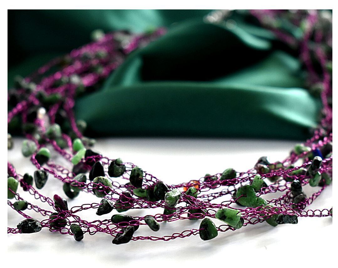 Κολιέ με τσίπς αχάτη σε σύρμα πλεγμένο με το βελονάκι. Οι σειρές, το μήκος καθώς και το χρώμα του σύρματος, μπορούν να καθοριστούν σύμφωνα με τις επιλογές σας.