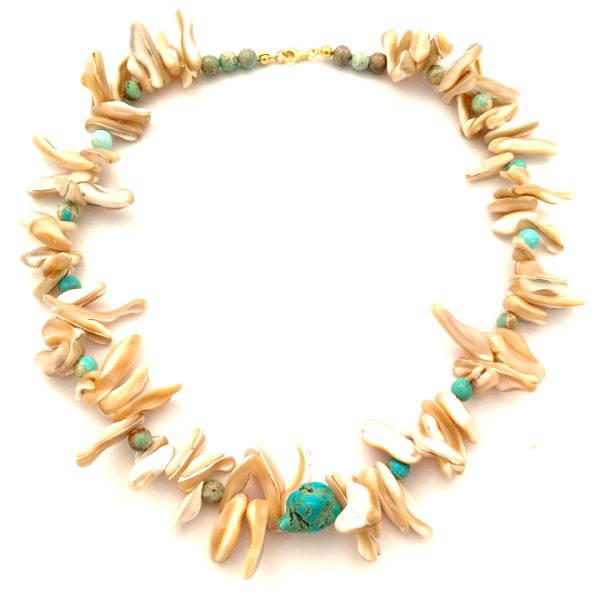 Κολιέ από φυσικό κοχύλι με τουρκουάζ μήκος 45 εκατοστά, κούμπωμα από επίχρυσο ασήμι 925.
