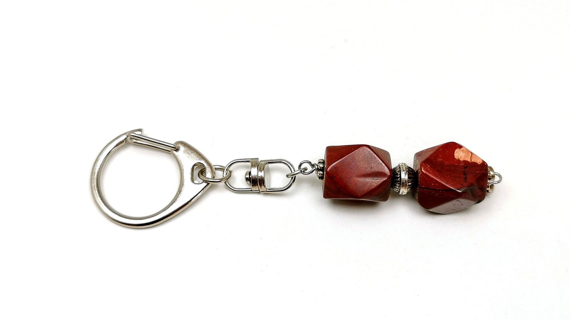 Μπρελόκ από Ίασπη, μέγεθος ακανόνιστο, στολισμένο με μεταλλικά στοιχεία. Παραδίδεται σε ημιδιάφανο πουγκάκι οργάντζας με καρτελάκι που αναφέρει το υλικό σε Ελληνικά – Αγγλικά.