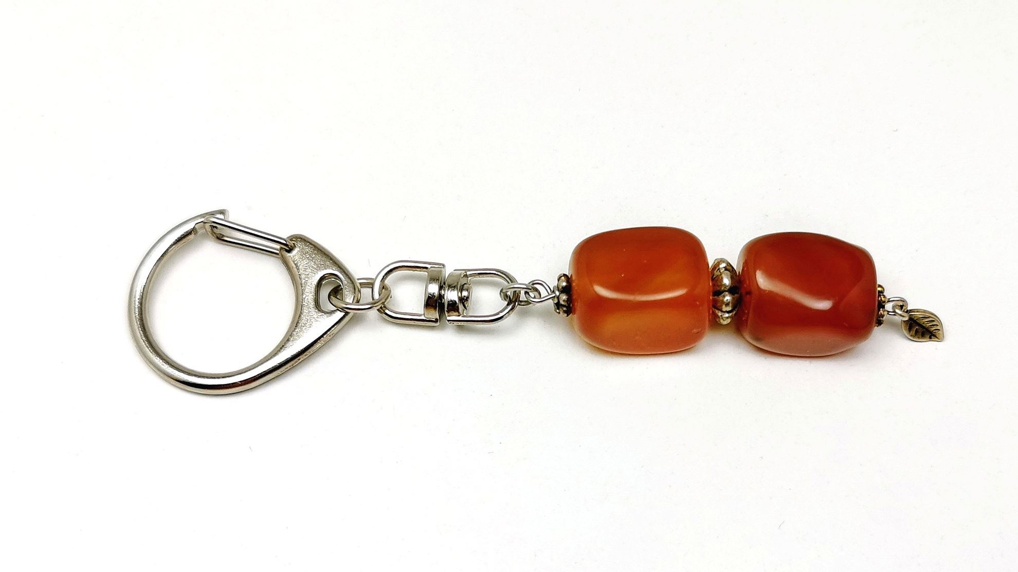 Μπρελόκ από Αχάτη Κορνεόλη, μέγεθος ακανόνιστο, στολισμένο με μεταλλικά στοιχεία. Παραδίδεται σε ημιδιάφανο πουγκάκι οργάντζας με καρτελάκι που αναφέρει το υλικό σε Ελληνικά – Αγγλικά.